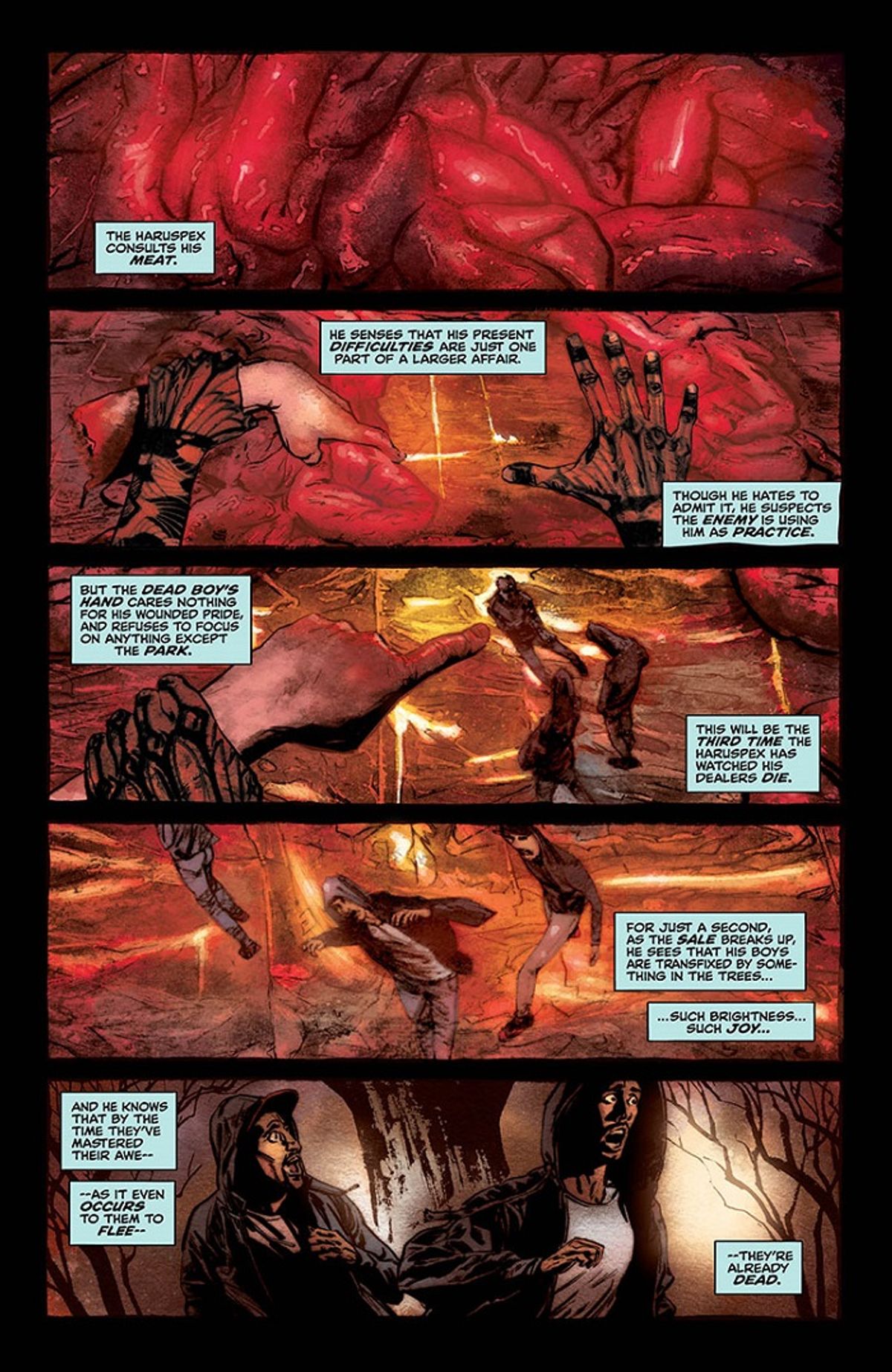 Spurrier - Una delle cose belle di una serie come Hellblazer, fatta di una sequela di archi narrativi brevi uno via l'altro, è che c'è una grande libertà nelle direzioni che si possono prendere. Per esempio, il nostro primo storyarc è una storia in tre parti chiamata A Green and Pleasant Land, che gira attorno a certe apparizioni inquietanti che si verificano in un parco di Londra, nottetempo. Un parco che sembra essere il territorio di una gang di spacciatori. Si tratta di un modo unico di mescolare gotico letterario, terrore fisico e crimine da strada, con Constantine preso nel mezzo. Il ciclo successivo ha invece al centro toni da commedia nera per un paio di numeri, per poi virare nel successivo verso un'avventura autoconclusiva molto poetica. E così via. L'unico fattore di coesione è la presenza di un occultista molto stanco.
