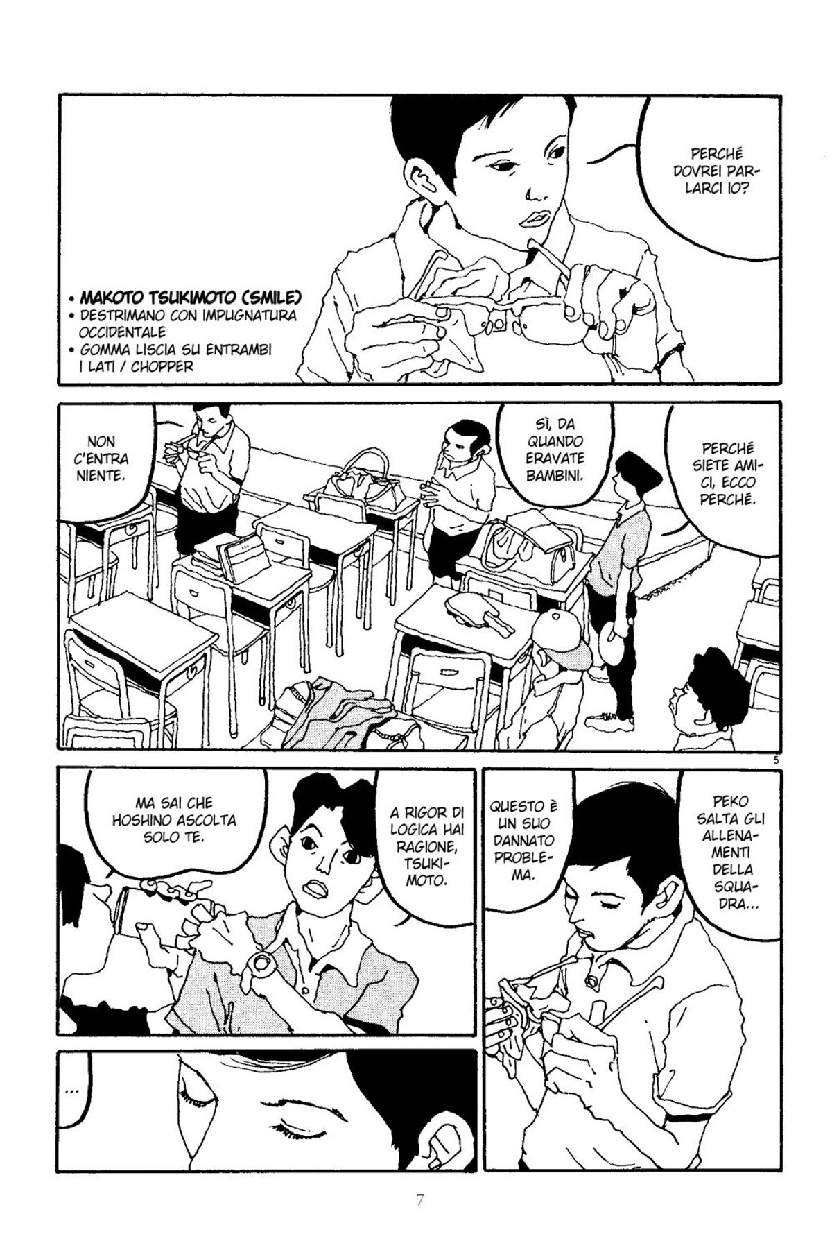 Peko – l’appassionato e carismatico eroe che Tsukinoto idolatrava durante la loro infanzia - gioca perché “ama il ping pong e odia perdere”. Smile - freddo, timido e taciturno – gioca “per ammazzare il tempo”. Un giorno incontrano uno studente cinese in Giappone per un periodo di studio, e la sconfitta che Peko subisce cambia per sempre l’approccio dei due verso questo sport. Insieme i due vedranno intrecciarsi all’attività agonistica le scelte che cambieranno la loro vita.