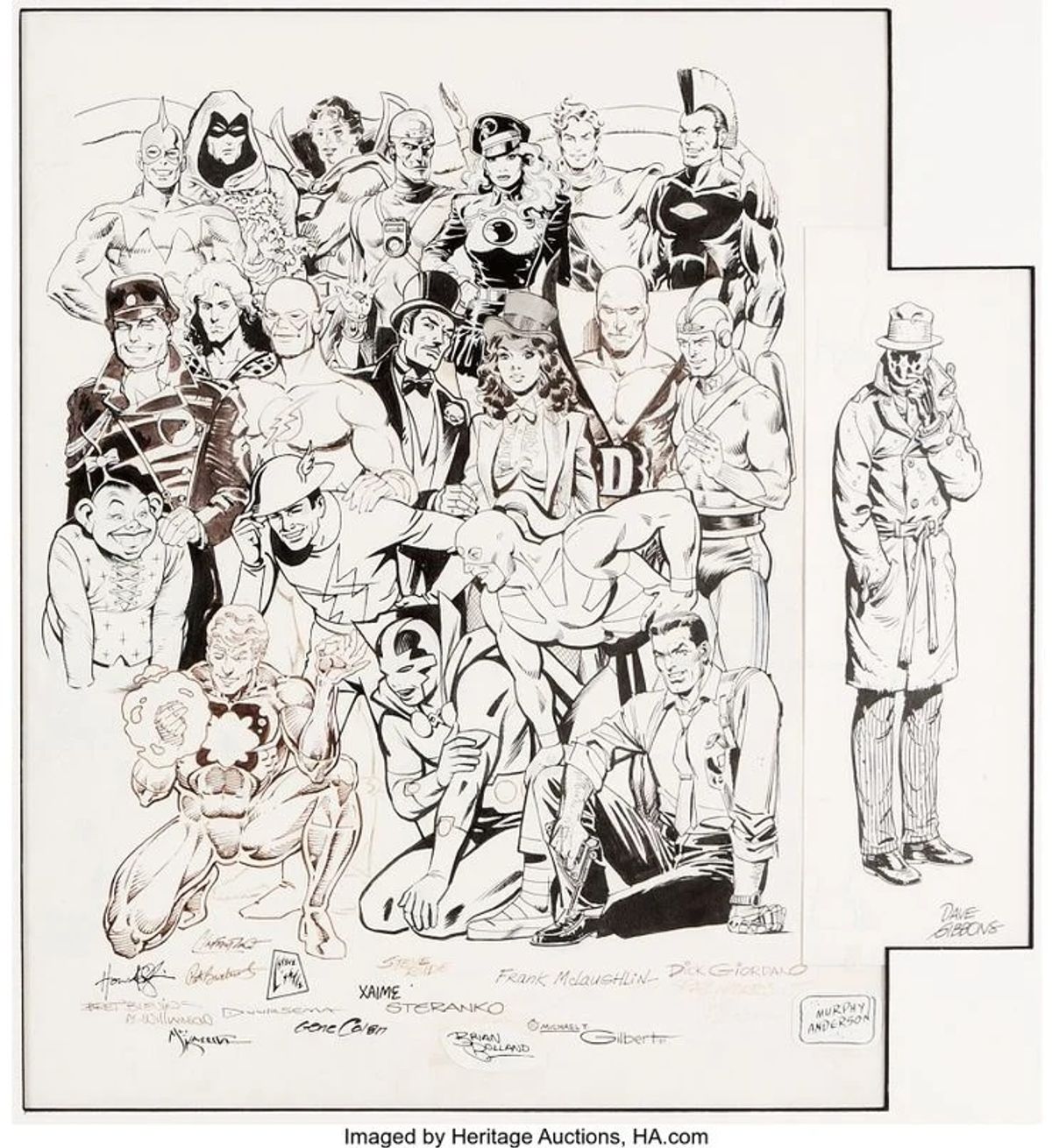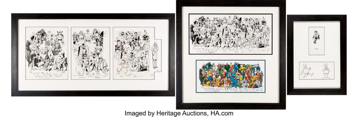 L’illustrazione originale è suddivisa in tre grosse tavole che sono passate da un artista all’altro per circa nove mesi. In passato, Chapman ha svelato che l’artista Wayne Boring è morto poco prima di dare il suo contributo, mentre Steve Ditko e Frank Franzetta si rifiutarono di prendere parte all’iniziativa.Date uno sguardo alla gallery qua sotto dove potete ammirare le tavole originali.