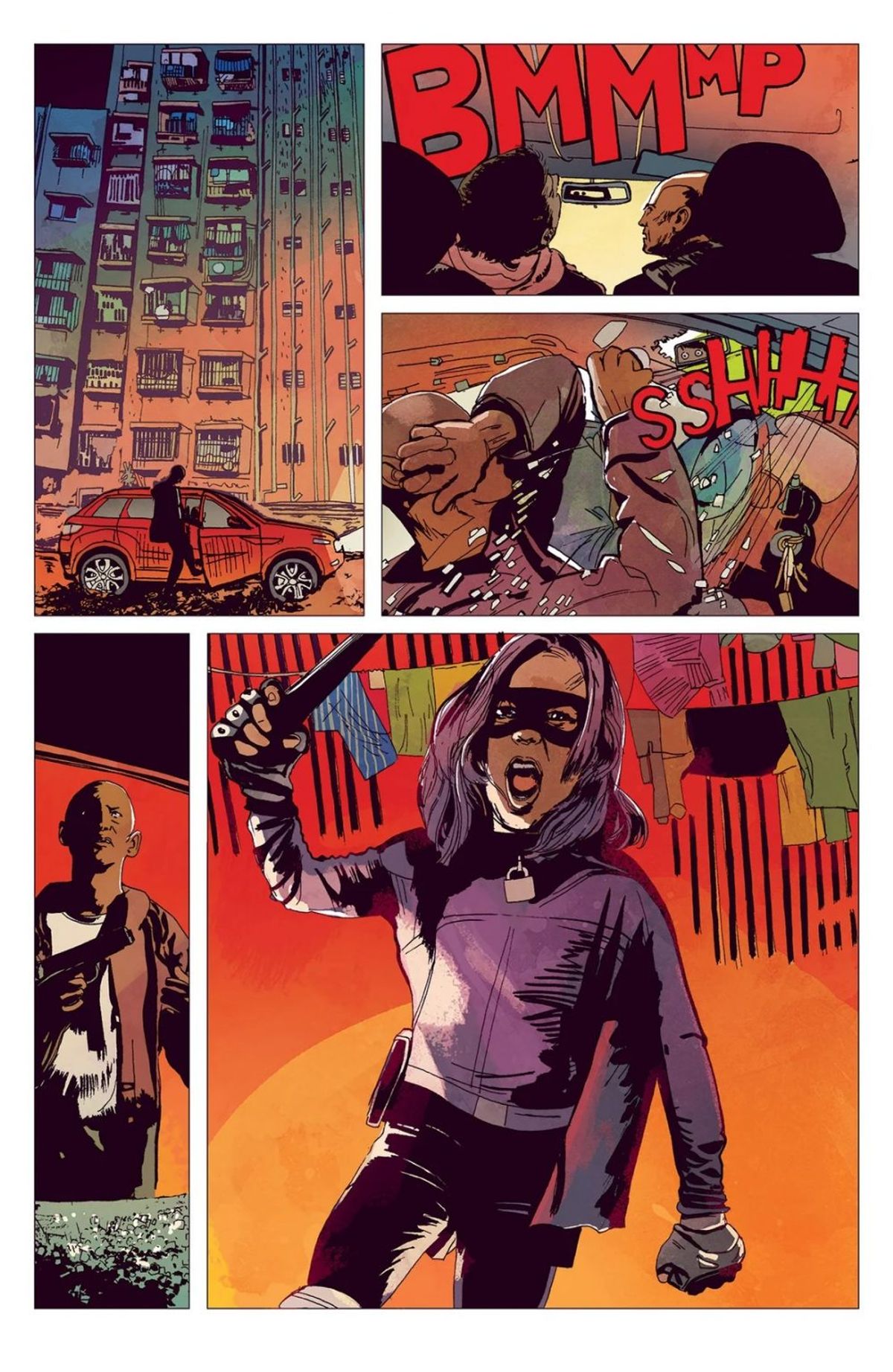 Sampson – Le persone estremamente ricche vivono accanto a quelle che possiedono pochissimo, e la città – una delle più grandi del mondo – è perennemente piena di gente, cose e suoni. Hit-Girl si immergerà in questo denso mare di vite e storie, e il nostro arco narrativo comincerà da lì.Il nostro titolo provvisorio era No Man's Land, e, senza fare troppi spoiler (Cosa riguarderà? Il non appartenere a nessuno? Il sentirsi a metà via? L'aver perso qualcosa? Qualcos'altro? Questo e altro ancora?) è da qui che siamo partiti. Inoltre, ci sono davvero tanti colori. Tutta la vita è qui, sostanzialmente. O almeno questa è l'impressione che ho avuto disegnando. È una Hit-Girl più morbida, che ha fatto un passo indietro per l'occasione.