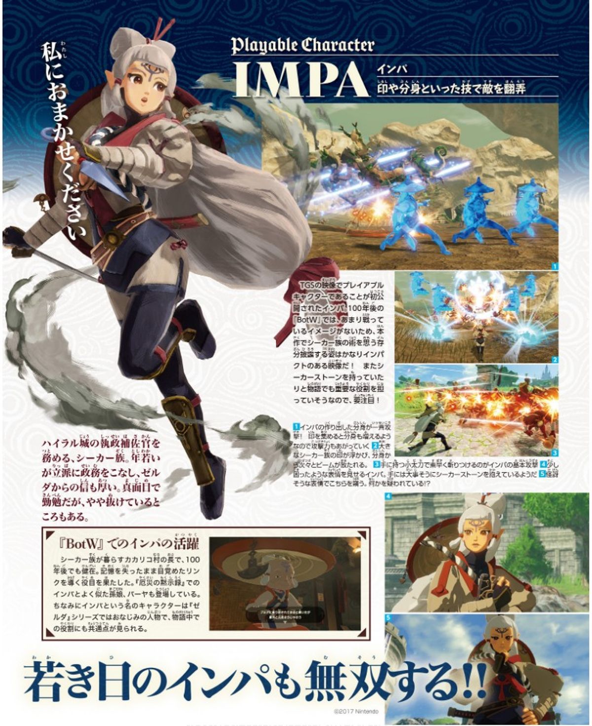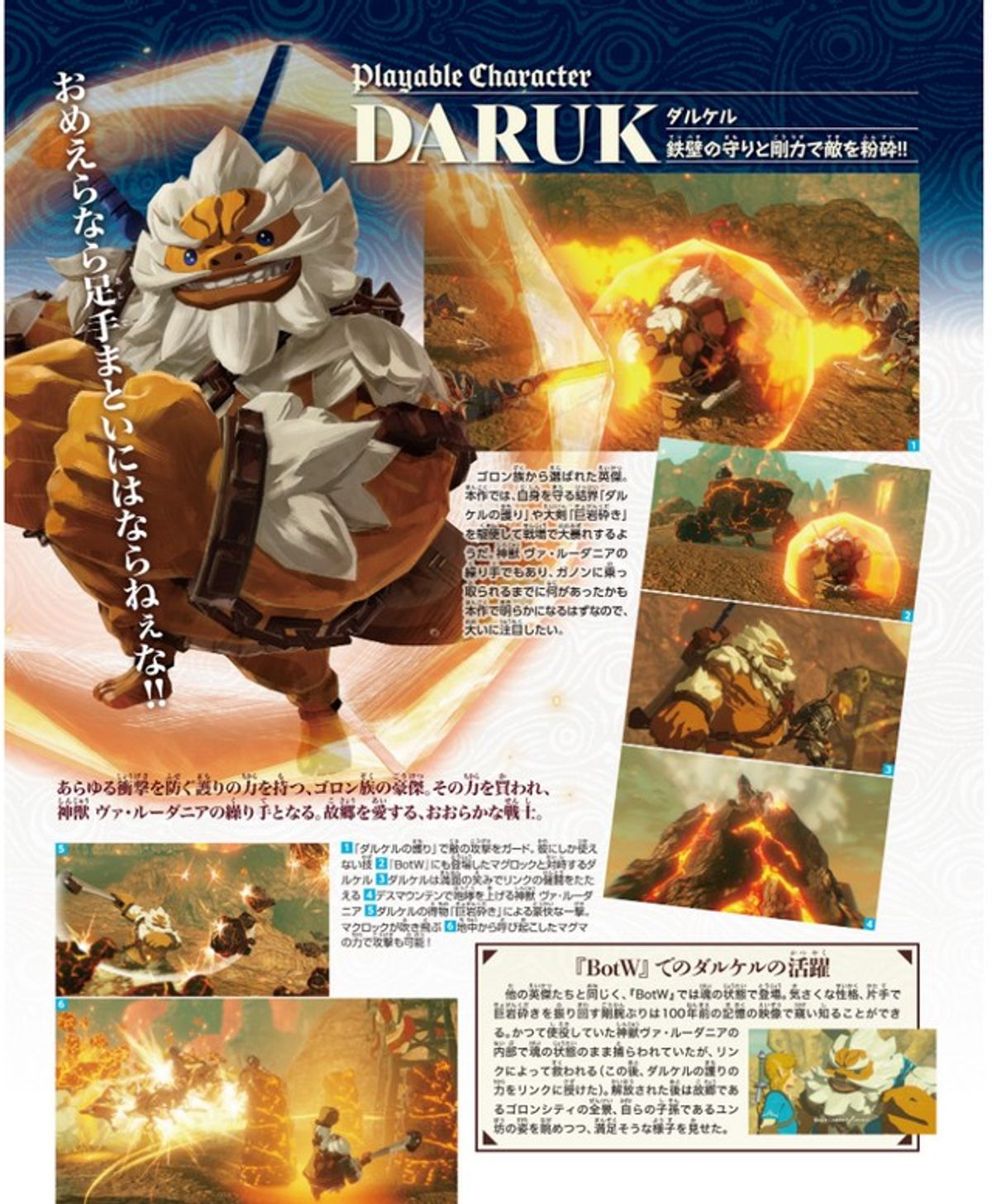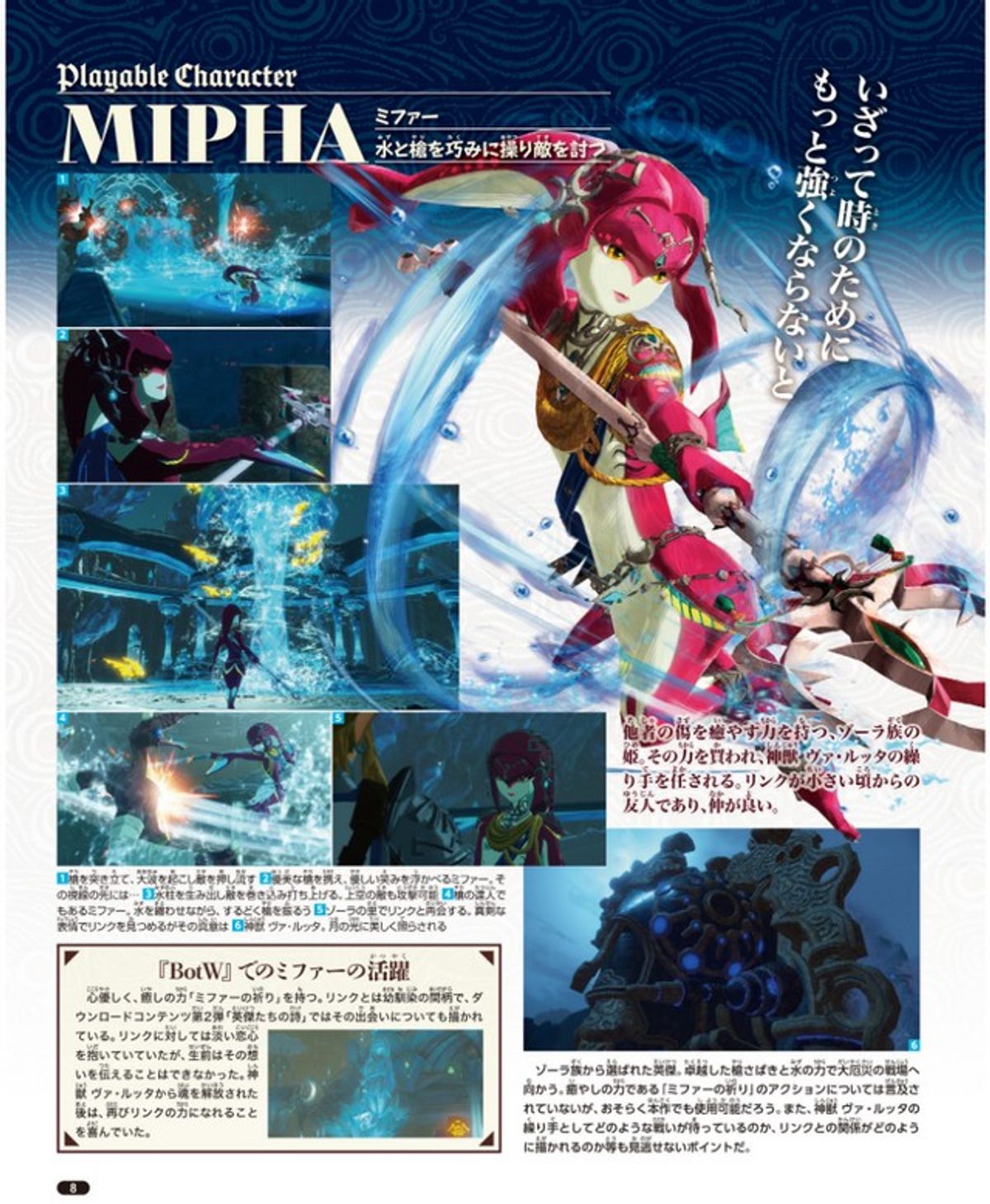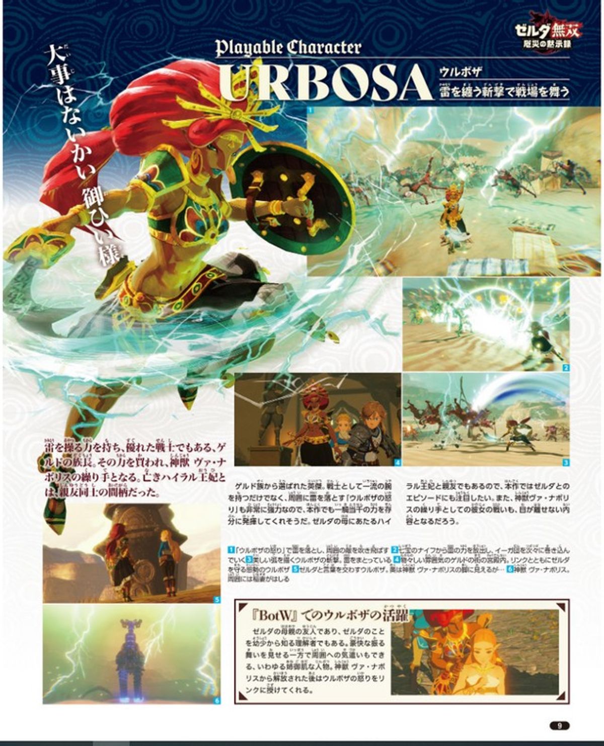 Qui sotto invece trovate le schede personaggio dei quattro campioni (Daruk, Revali, Mipha e Urbosa) e della giovane Impa, già confermati tra i personaggi utilizzabili insieme a Link e Zelda: