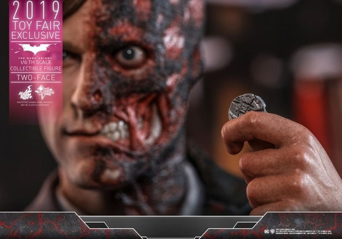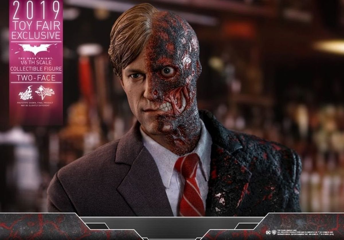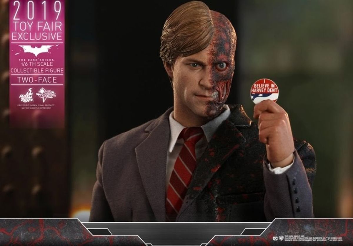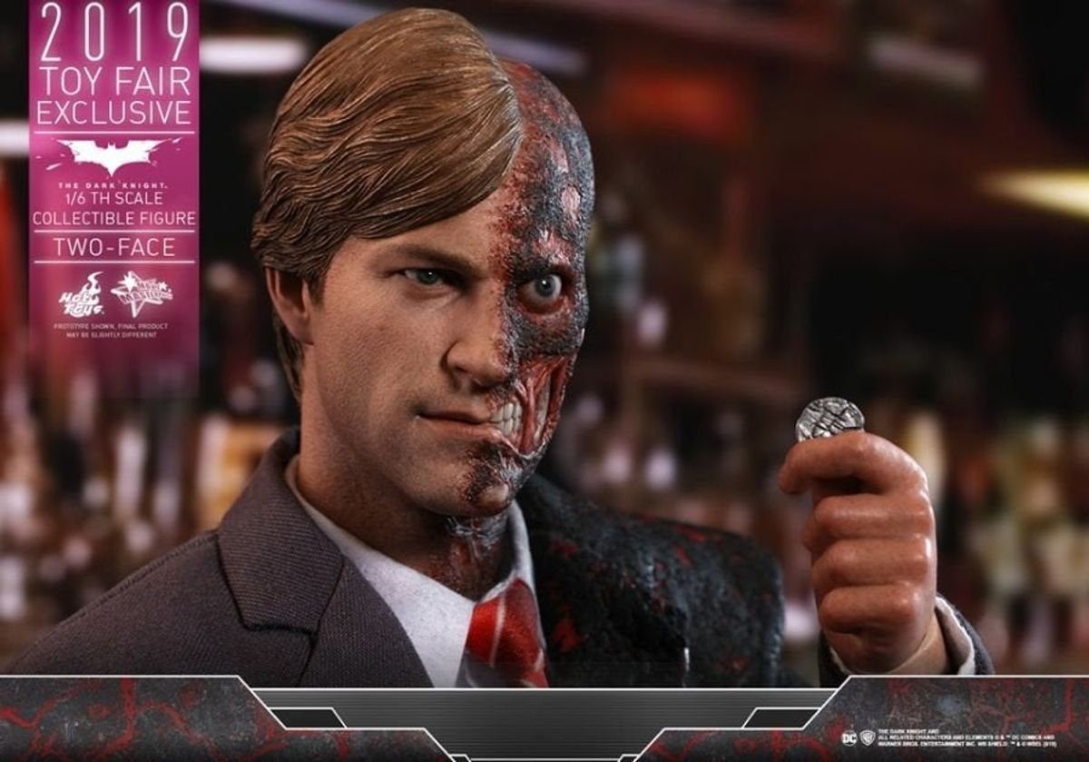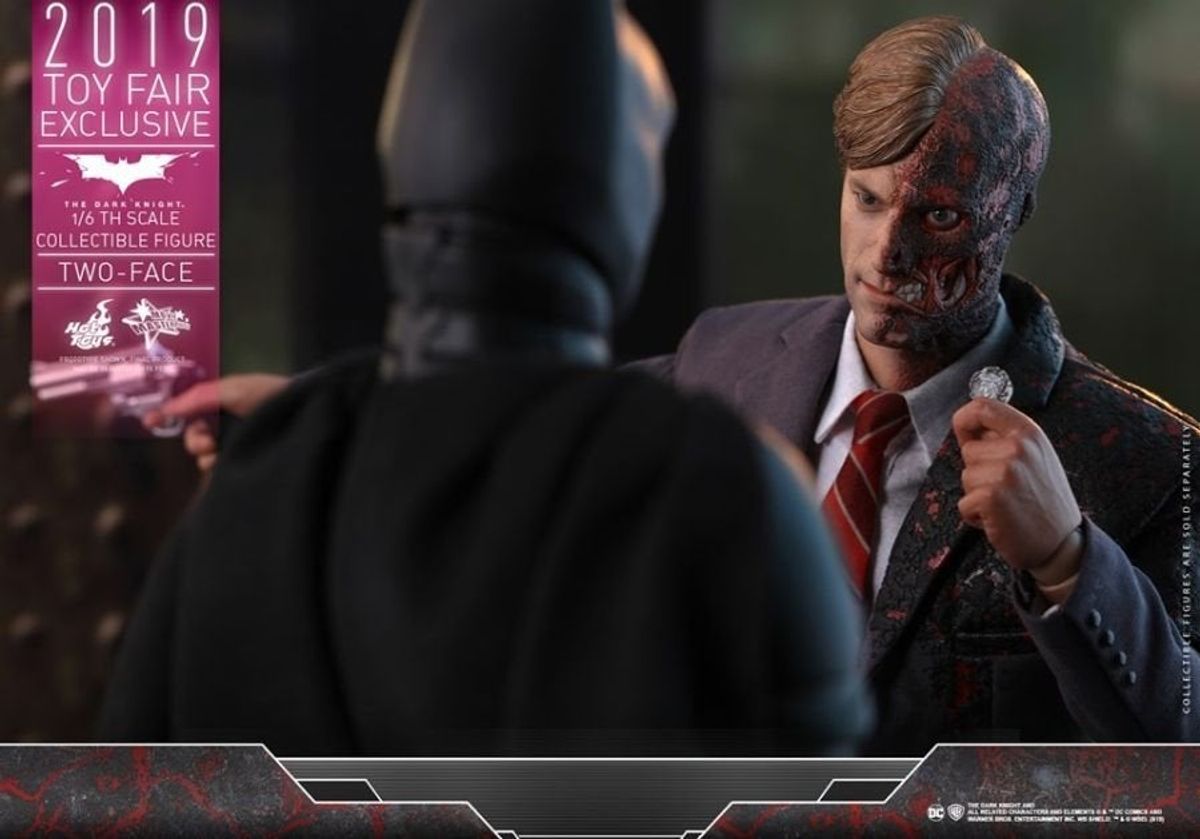 In occasione della Toy Fair 2019 la Hot Toys ha diffuso in rete le immagini della nuova figure da collezione in scala 1:6 di Due Facce /Harvey Dent da Il Cavaliere Oscuro, film del 2008 diretto da Christopher Nolan.