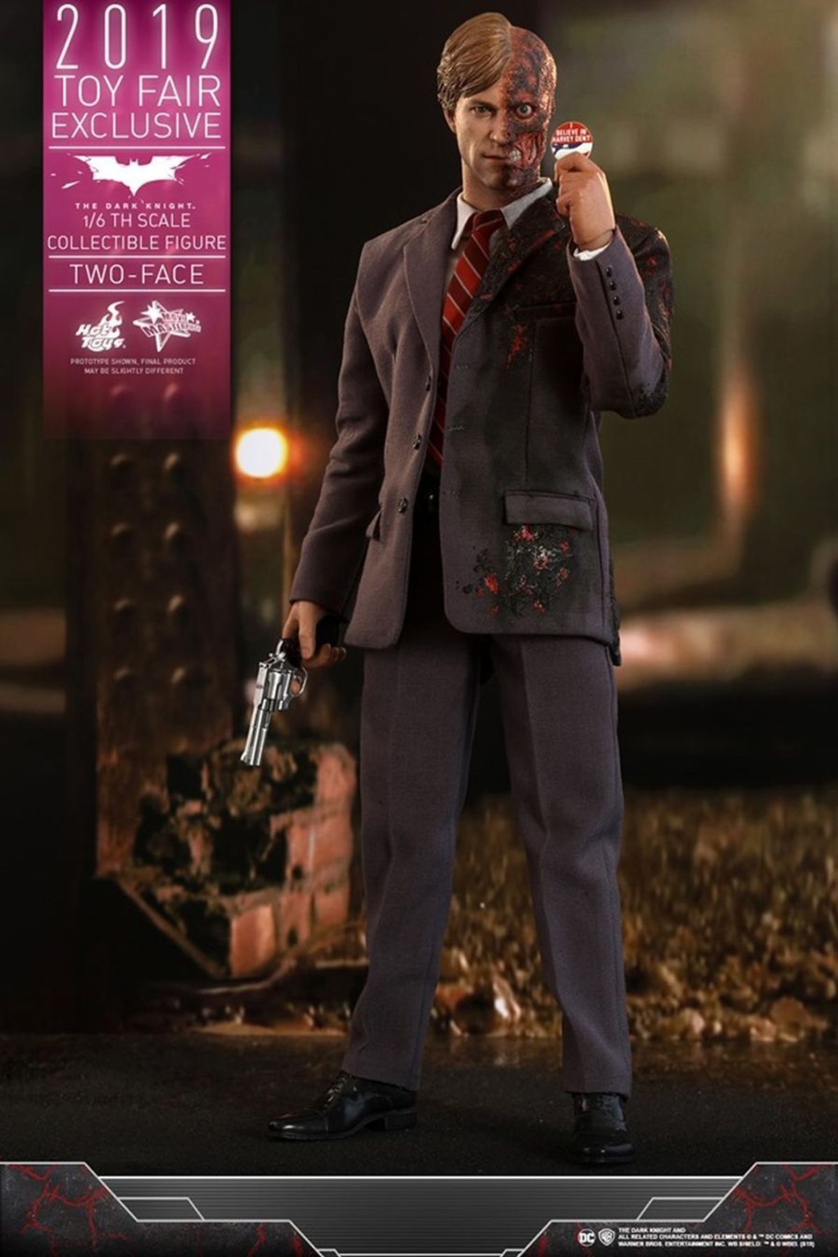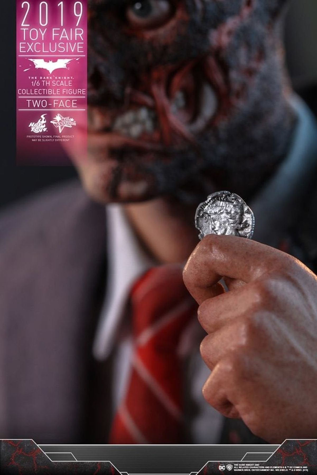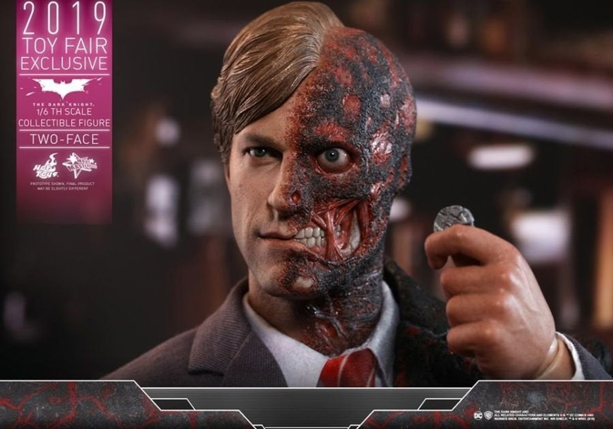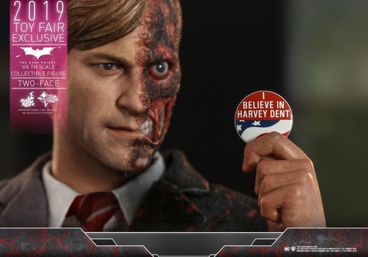 In occasione della Toy Fair 2019 la Hot Toys ha diffuso in rete le immagini della nuova figure da collezione in scala 1:6 di Due Facce /Harvey Dent da Il Cavaliere Oscuro, film del 2008 diretto da Christopher Nolan.