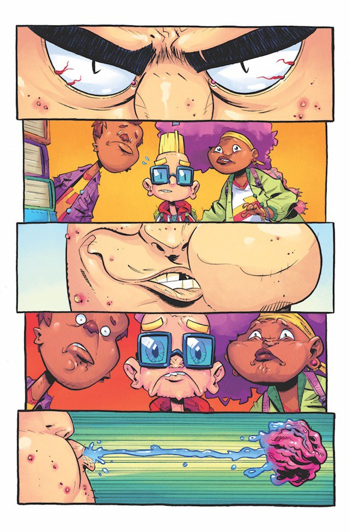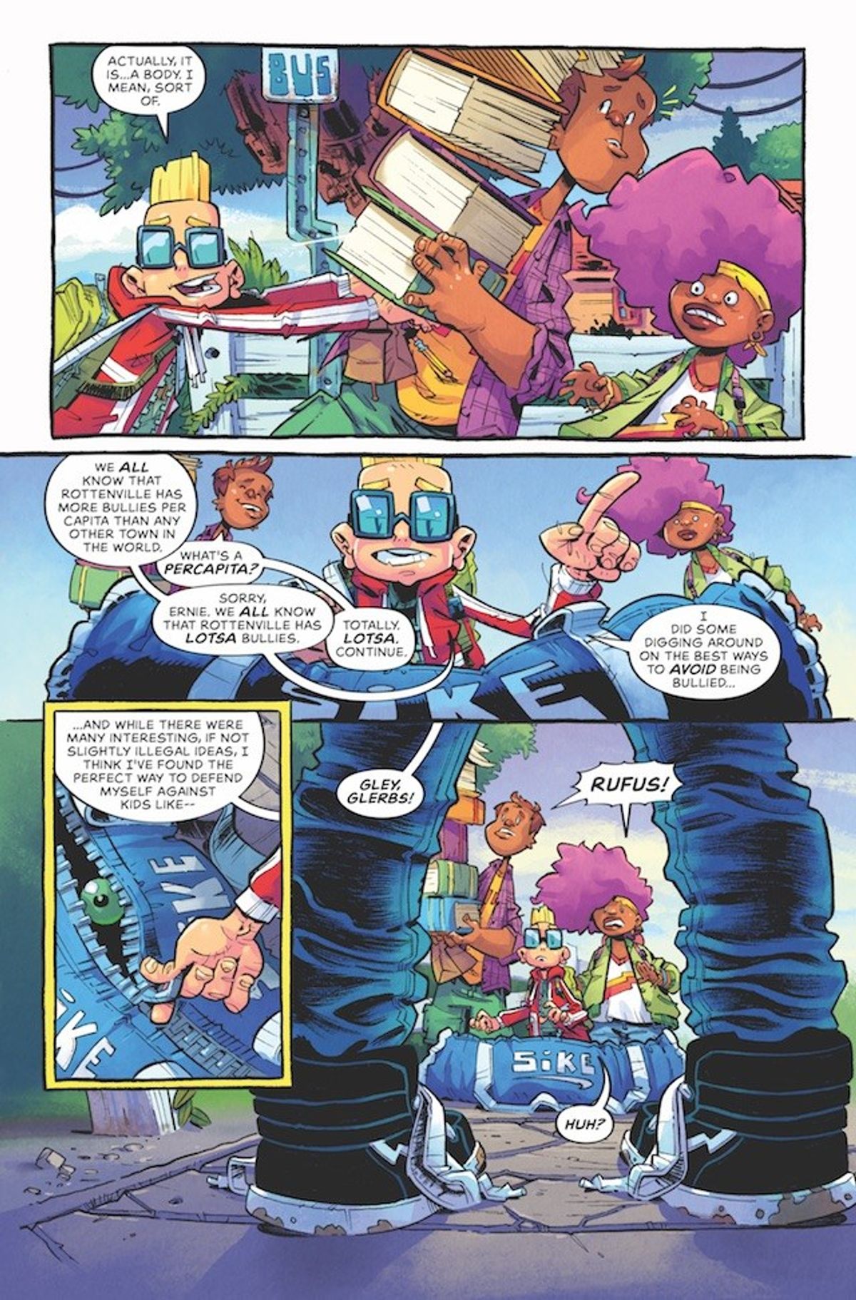Non è cambiata tantissimo, ma nella maniera giusta per lo sviluppo dei personaggi. Prima era tutta incentrata su Rufus e Hock. Ora il secondo è diventato quasi il simbolo del peggior bullo che esista e si sono aggiunti Spencer, Edith ed Ernie, personaggi che danno alla storia quel che le mancava dieci anni fa. Il finale del primo numero è cambiato moltissimo, ma ancora non posso parlarvene.Ovviamente, anche il linguaggio iconografico è diverso da allora. Credo che Aaron sia stato importante per rendere il progetto più maturo. Ho la tendenza a rendere i miei personaggi molto giovani, mentre Aaron meno. Ha trovato un compromesso grandioso per il linguaggio visivo degli studenti, e questo ha portato il fumetto a un livello molto più elevato di quanto potessi fare io. Inoltre, aggiunge un sacco di dettagli divertenti agli sfondi ed è molto attento ai particolari, il che crea nuovi livelli di lettura.