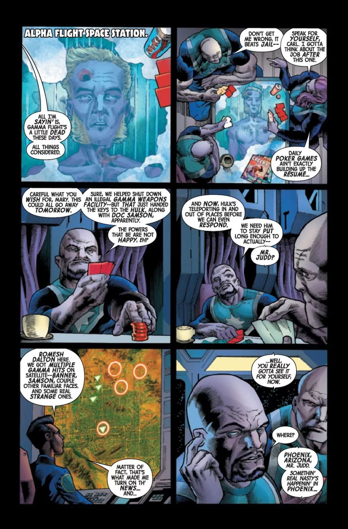 Ewing - Una volta preso l'abbrivio, mi sono sentito libero di trascinare alcuni elementi nella storia, di creare legami con il passato, rispondere ad alcune domande in sospeso. Se Betty non era la prima persona chiamata da Bruce dopo la resurrezione, doveva esserci un motivo più serio della precauzione sui comprimari storici. L'unico modo per spiegarlo era riprenderne alcuni. Allo stesso modo, Doc Samson era di nuovo in vita e la cosa non aveva ancora spiegazione. Per scoprirla, bisognava che tornasse in scena. Uno alla volta, i membri del cast di supporto hanno fatto il proprio ritorno. Per ognuno, ho fatto approfondite ricerche.