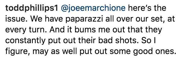 https://www.instagram.com/p/BoDJn5NgueP/?taken-by=toddphillips1Un utente ha poi fatto notare al regista che in giro ci sono già troppe foto del film e la risposta del filmmaker è stata la seguente: