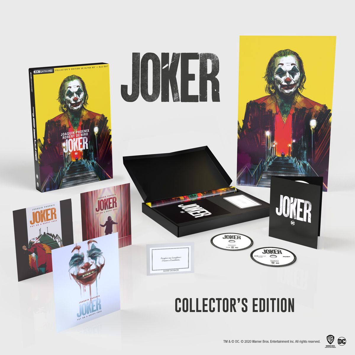 “JOKER”, il film diretto, co-scritto e prodotto da Todd Phillips, vincitore di 2 Oscar (“Miglior attore protagonista” per l’interpretazione di Joaquin Phoenix e “Miglior Colonna Sonora Originale” per il lavoro di Hildur Guðnadóttir), 2 Golden Globe e del Leone D’Oro per il Miglior Film alla 76° Mostra Internazionale d’Arte Cinematografica di Venezia, torna dal 9 dicembre con la “Joker Collector’s Edition”, un’esclusivo cofanetto in edizione limitata, che includerà il film nei formati 4K Ultra HD e Blu-ray, un Poster, tre Art Card e la replica del biglietto “Forgive my Laughter: I have a Condition”.