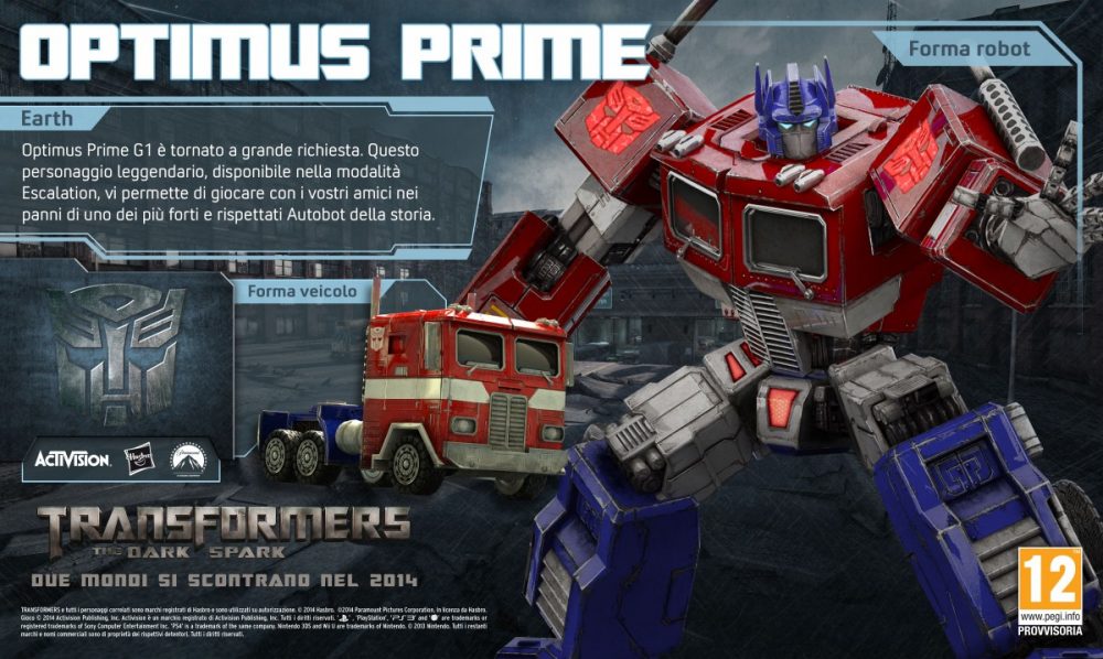 Activision ha svelato l'aspetto di Optimus Prime nel prossimo titolo dedicato ai Transformers, ovvero Transformers: The Dark Spark, in uscita nel corso dell'estate, come ad accompagnare il film Transformers: Age of Extinction, per PlayStation 3, PlayStation 4, Xbox 360, Xbox One, Wii U e Nintendo 3DS. Il leader degli Autobot sarà presente in tre versioni, che vi mostriamo, fornendovi anche alcune informazioni al riguardo, prese dal comunicato stampa diffuso.