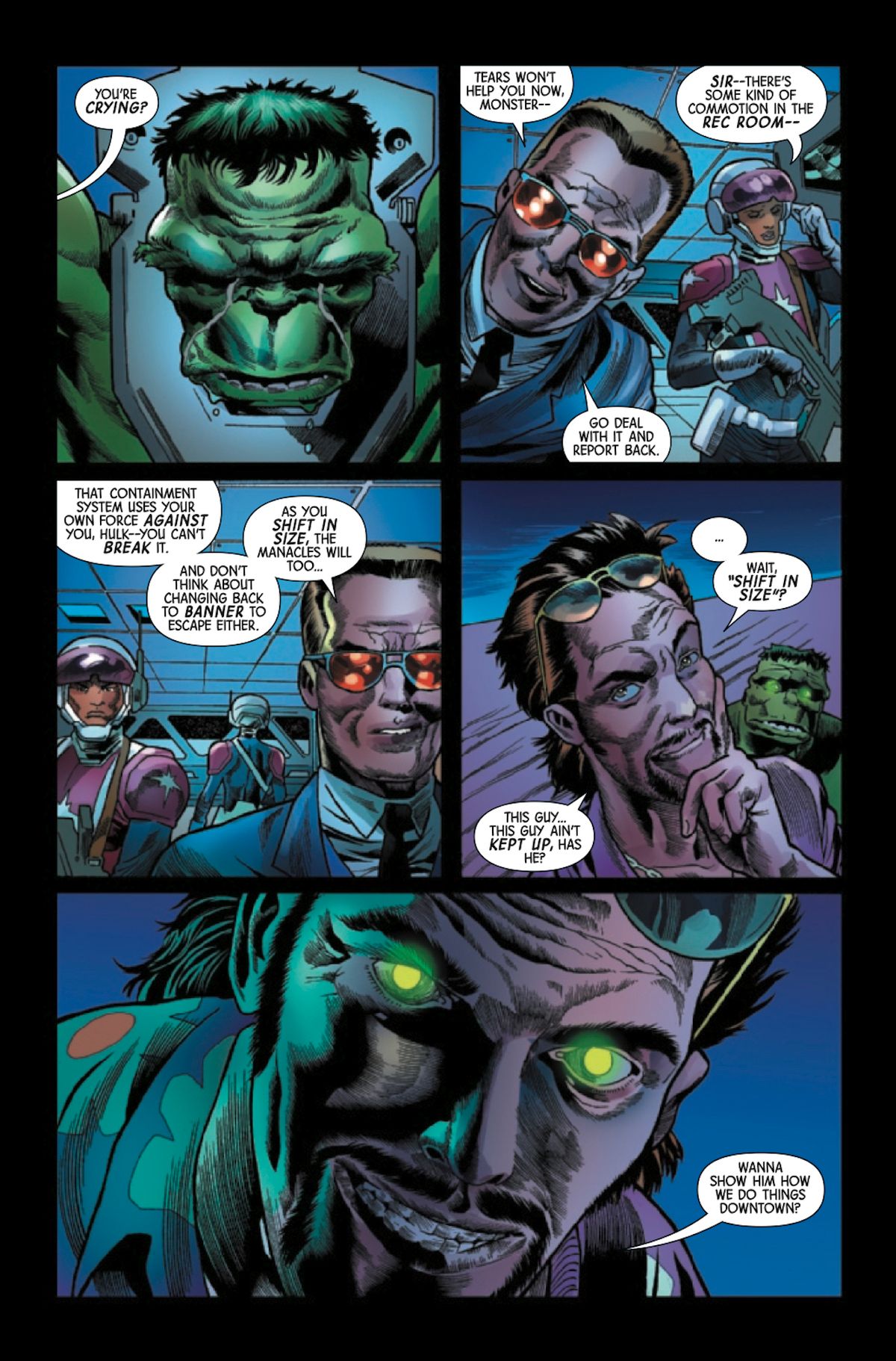 Sin dalla sua primissima storia, l'Incredibile Hulk è stato un personaggio horror, quindi è molto semplice farlo scivolare verso questo genere. Ma è anche l'eroe Marvel che sfugge più facilmente all'ordine costituito, che cede letteralmente alla furia nei confronti della società e, di solito, contro l'autorità. Per fare un esempio molto basilare, mentre Tony Stark costruiva armi per il governo e la guerra del Vietnam, Hulk spaccava carri armati nel deserto. Avendo questa componente nel proprio DNA sin dagli anni Sessanta, può naturalmente spingersi in territori che difficilmente sono accessibili ad altri eroi.Se il Capo appare più sinistro del solito credo dipenda semplicemente dal fatto che mi piacciono gli antagonisti che si divertono quando lavorano. E Joe Bennett ha dato splendidamente voce a questa mia caratteristica. Credo che metterlo a confronto con Bruce sia tematicamente interessante. Che io sappia, infatti, Samuel Sterns non soffre di disturbo dissociativo della personalità, non è un sistema di identità come Banner. Se affronti il Capo, hai sempre il Capo come avversario, quindi ho cercato di tracciare una linea di coerenza, a posteriori, all'interno dei suoi piani e dei suoi obbiettivi, per come li abbiamo visto nel corso dei decenni.