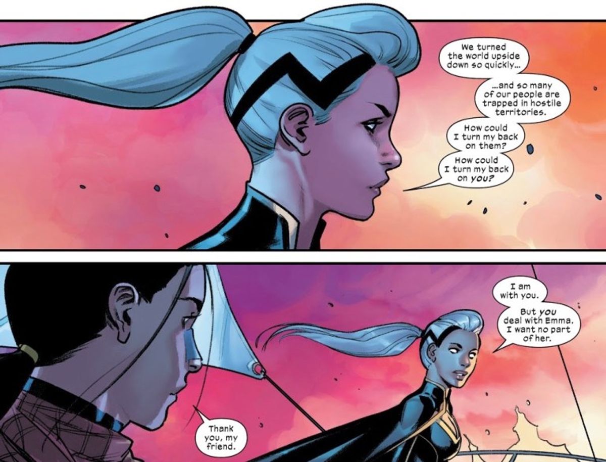 Nel frattempo, è momentaneamente separata dal resto del genere mutante. Persino gli umani possono entrare a Krakoa, ma lei no. So che molti suoi fan si sentono un po' abbandonati e delusi di lei dopo la lettura del primo numero. Non era quello che volevo ottenere, ma se tornassi indietro lo rifarei. Spero vi piaccia quel che seguirà.