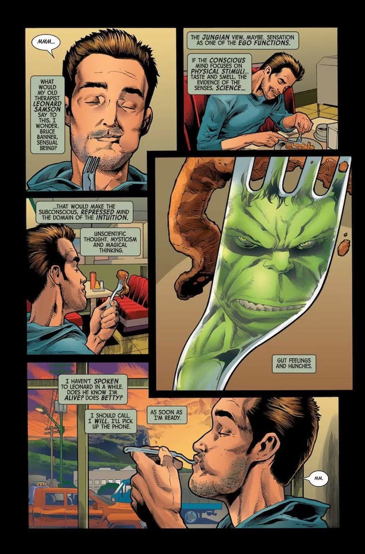 Quel che dobbiamo ricordare è che Hulk è intelligente, forse anche più di Banner, e non sembra avere alcun problema morale riguardo a chi sia la vittima della sua intelligenza o della sua forza. Chiunque incorra nella sua ira, o in quella di Bruce, sembra andare bene. Ognuno ragioni su quanto sia a suo agio con questo pensiero. E non provate a mentirgli: riconosce le menzogne dall'odore.