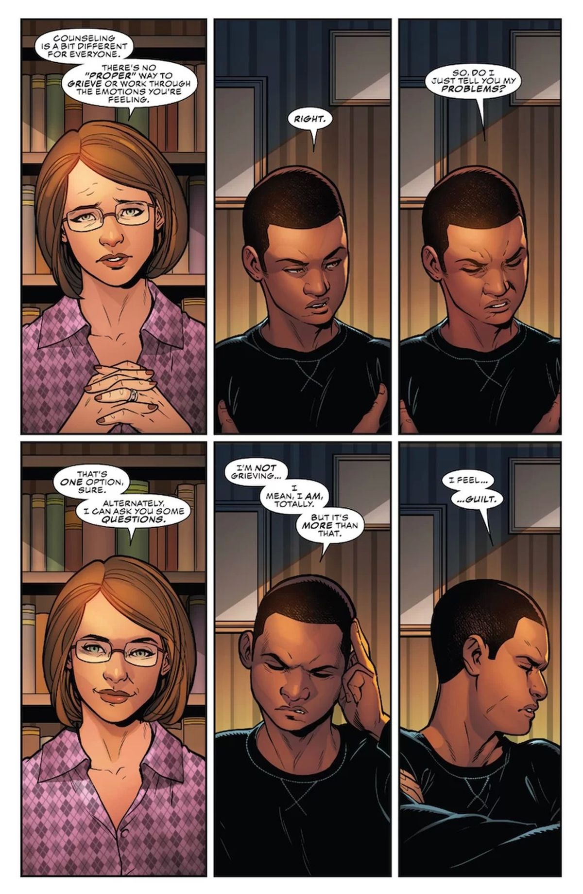 Volevo mostrare la specifica esperienza di Miles, ma anche illustrare i modi in cui, nella realtà, è possibile condurre qualcuno fuori dalla propria bolla, le conversazioni, i momenti in cui realizziamo che le cose che abbiamo passato dentro di noi possono essere espresse al di fuori. Per me era importantissimo. Anche se si tratta solo di poche pagine, volevo evitare gli stereotipi, rendere la scena realistica.