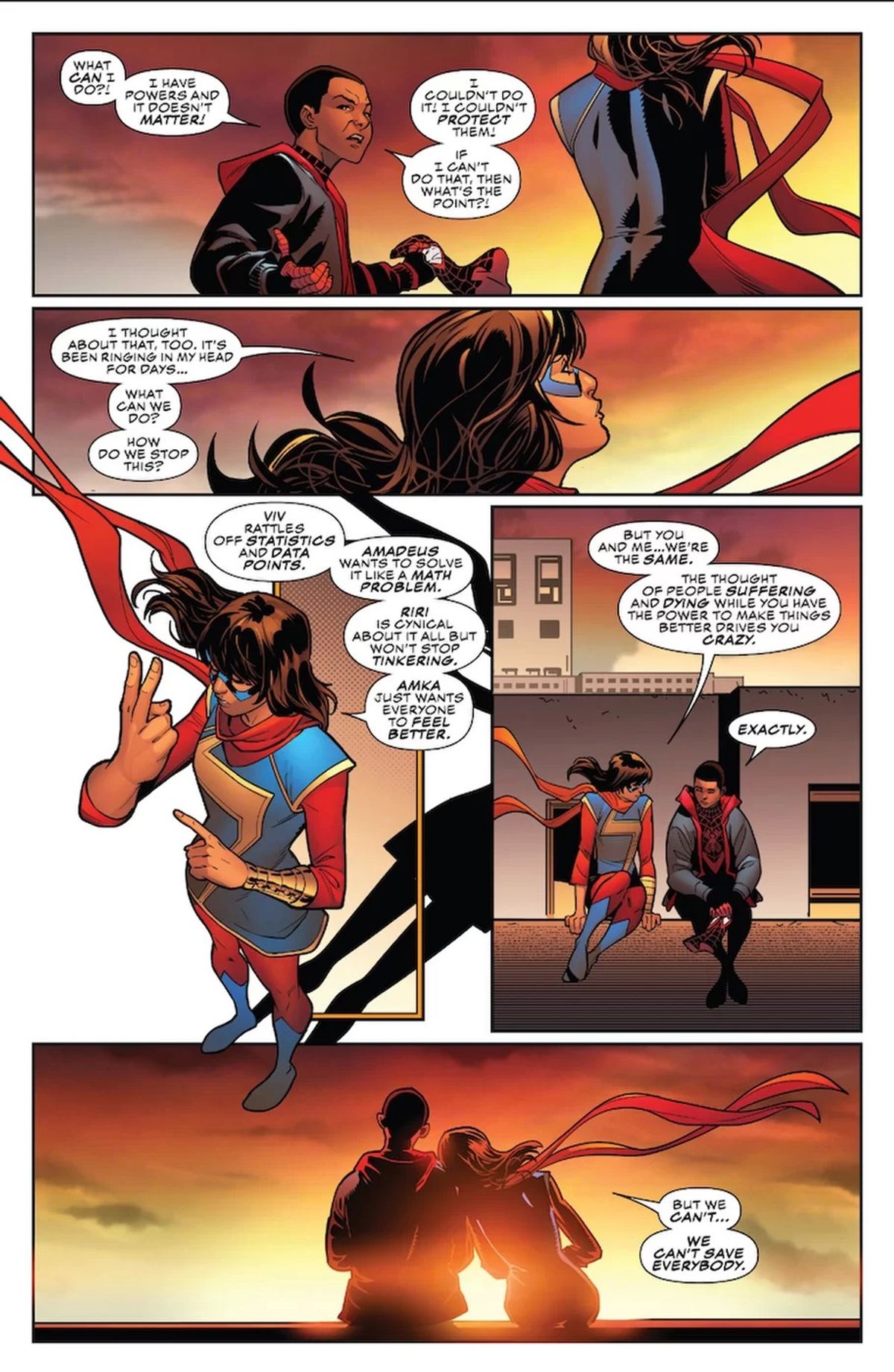 La scena in cui la sparatoria avviene alla scuola di Kamala è stata difficilissima da scrivere per me e ancor più da vedere sulla pagina, perché colui che la commette non è un super cattivo bizzarro ed esagerato. In quel momento vediamo per un secondo qualcosa che davvero accade nell'America del 2018, e per realizzarla, Sean e gli altri hanno ricevuto da me vere foto, veri video, veri contributi dei notiziari, che abbiamo calato nell'Universo Marvel. Era importante farlo, ma ci ha anche spezzato il cuore.