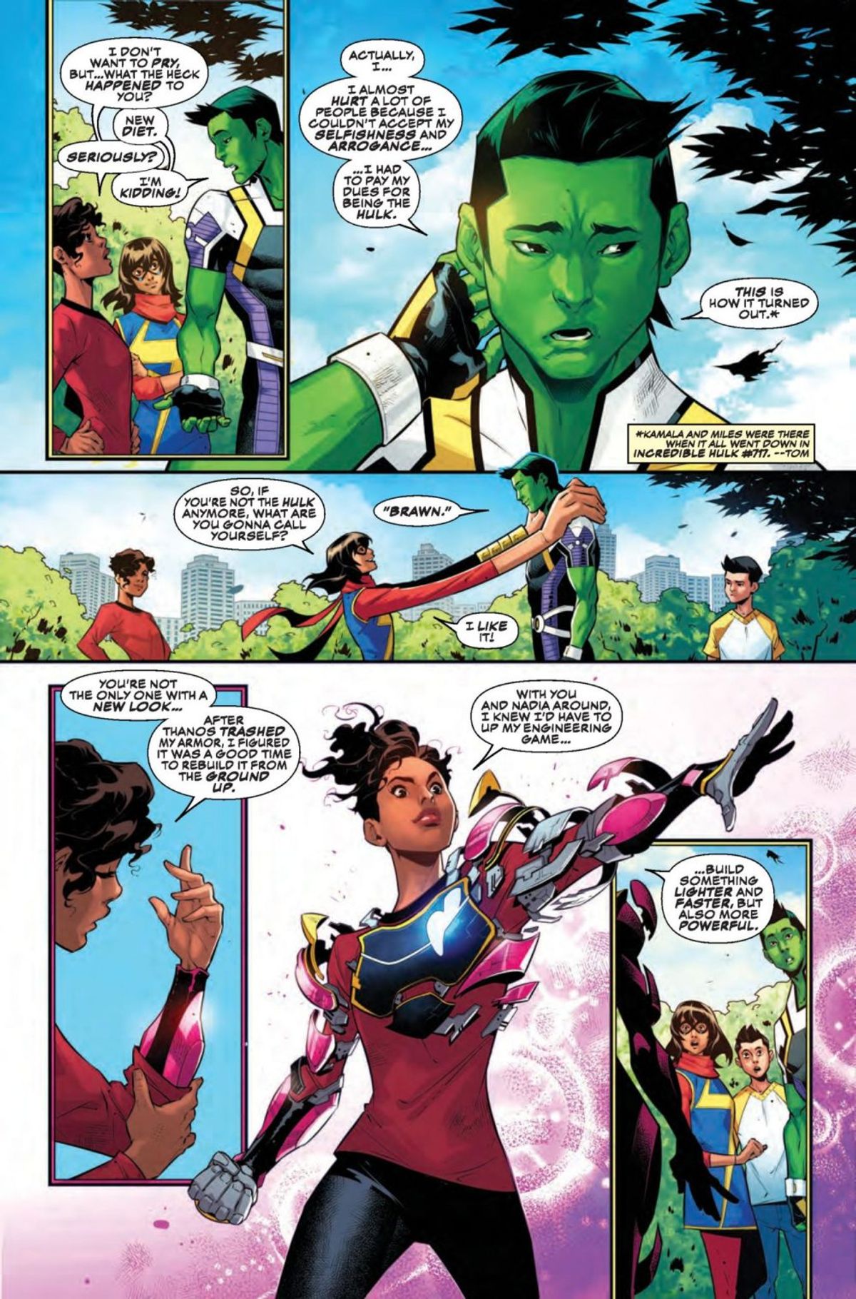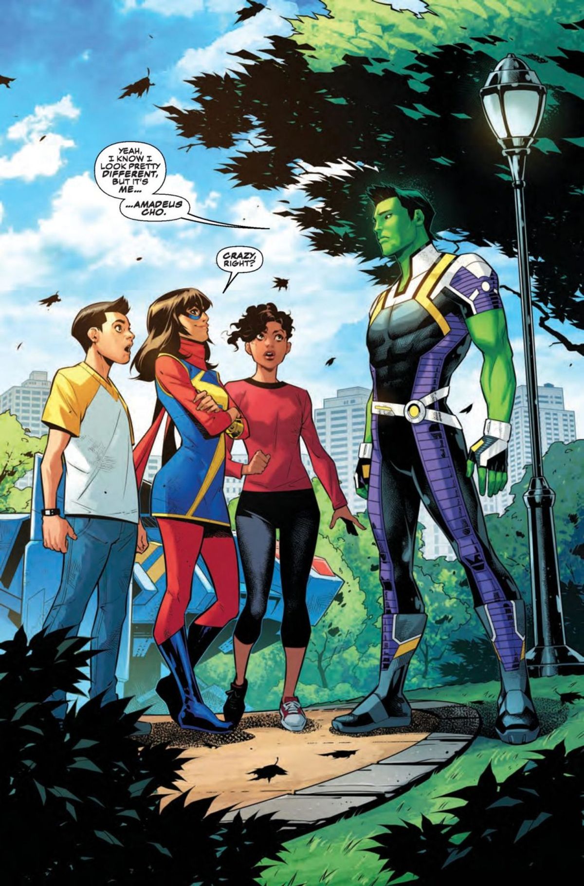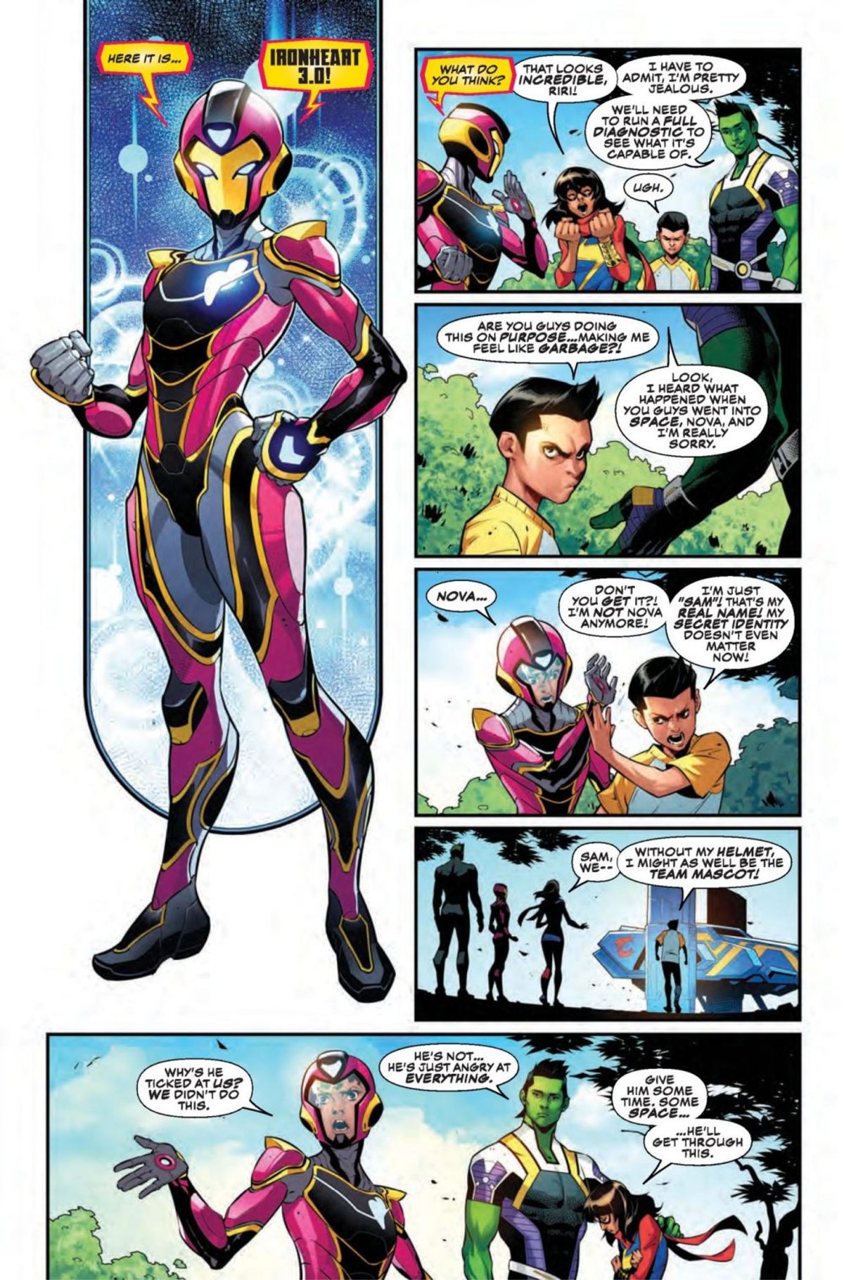 All'interno della stessa illustrazione viene mostrata Ironheart 3.0, la nuova armatura di Riri Williams, in sostituzione della precedente, distrutta da Thanos, e viene lasciato intendere che Sam Alexander non vestirà più i panni di Nova, visto che in assenza dell'elmo non ha modo di accedere ai poteri.Di seguito trovate la sinossi e un'anteprima di Champions #22, oltre alla tavola di Incredible Hulk #717 da cui è scaturita la svolta di Amadeus: