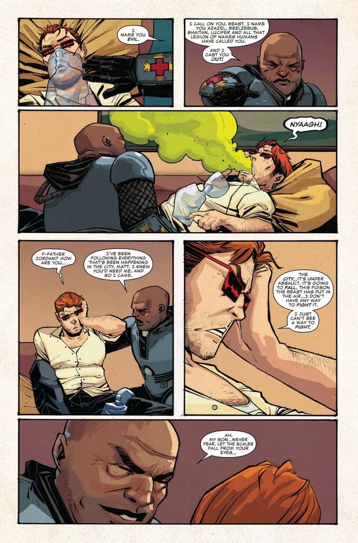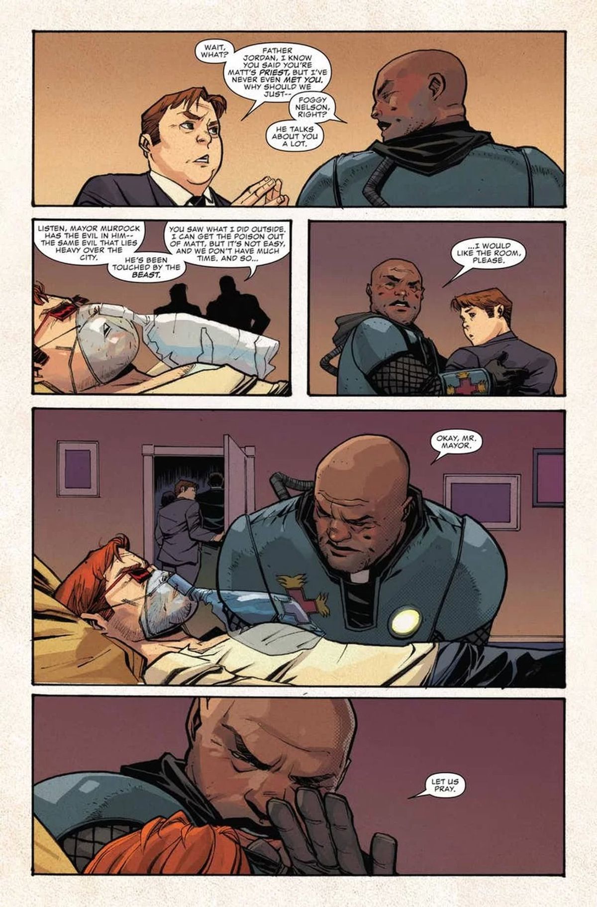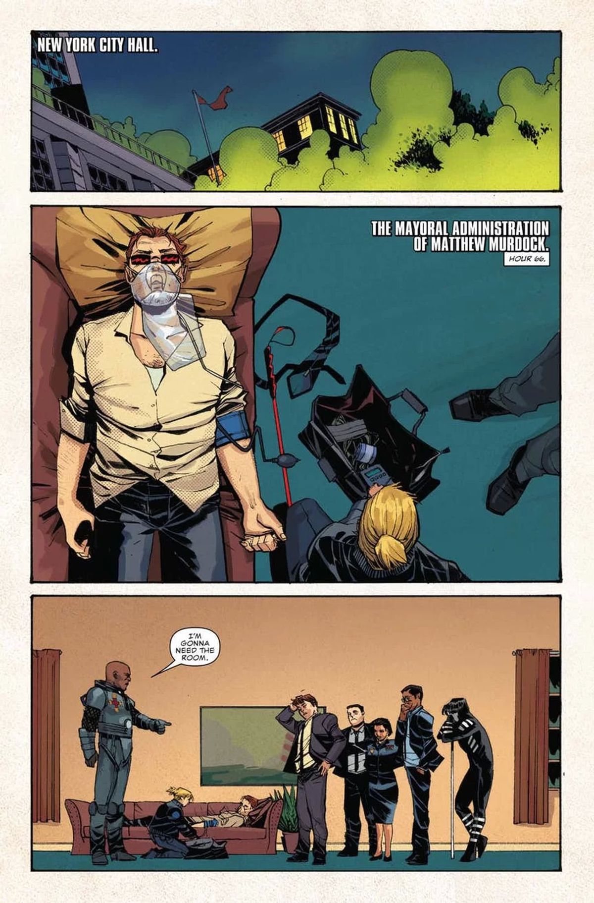 Soule ha quindi parlato dei due artisti che lo stanno accompagnando in questa fase della vita di Daredevil. Mike Henderson è un grandissimo artista quando si tratta di ritrarre l'azione, secondo lo sceneggiatore, ed è inoltre uno dei migliori disegnatori di Foggy Nelson di sempre. Anche per Chris Sprouse, Karl Story e Marte Gracia ci sono state parole di encomio; inoltre, Soule non sottovaluta certo l'importanza delle copertine nel successo di una serie.La storyline Mayor Murdock copre un periodo molto specifico e particolare della storia dell'Ufficio del Sindaco di New York. Nel numero #603 non sono passati più di tre giorni dacché la Mano ha cacciato Wilson Fisk, e Matt Murdock ha assunto le funzioni di sindaco. Sta cercando di capire come salvare la città dalle minacce più immediate. Il resto, cose come il bilancio e la sistemazione della metropolitana verso Albany, dovrà aspettare.