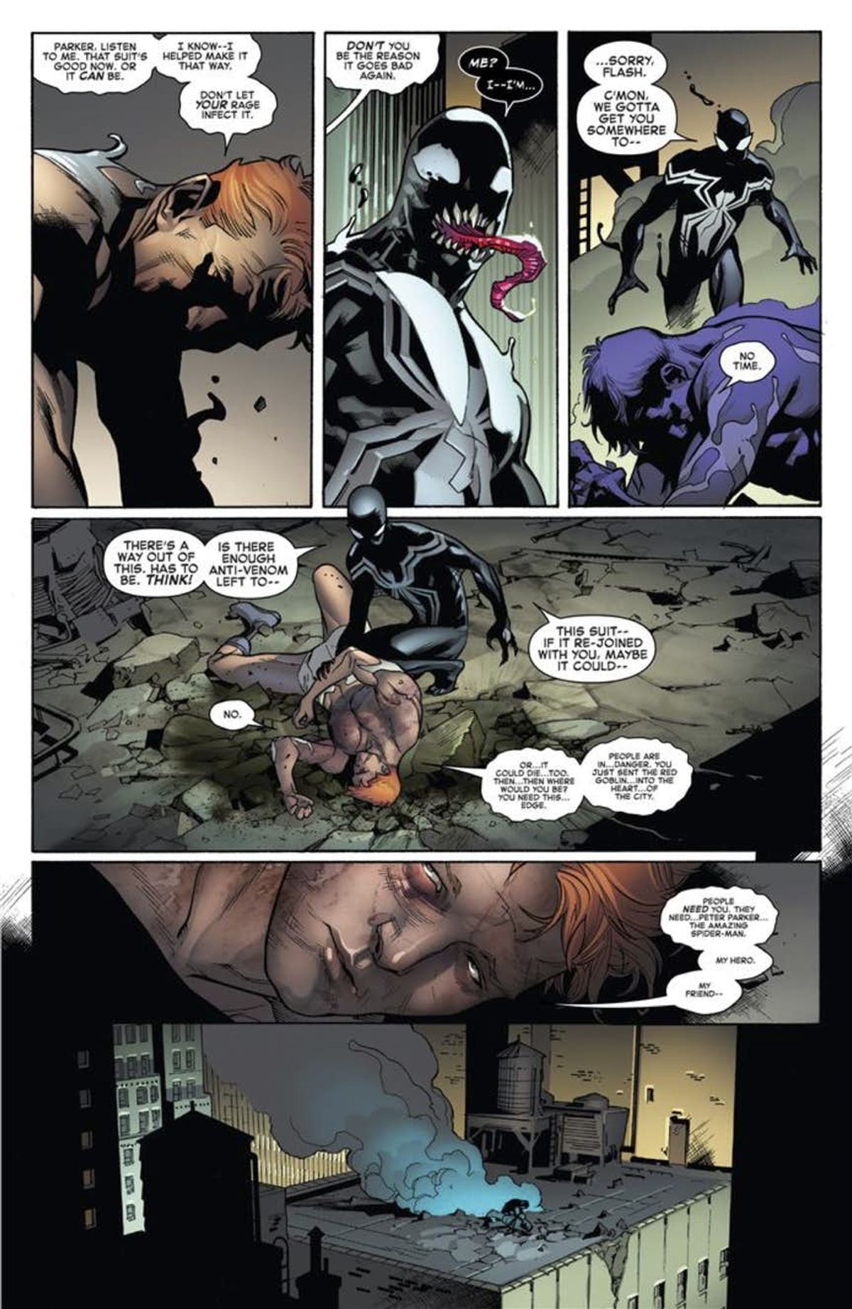 Pochi secondi prima di spirare, per Flash c'è giusto il tempo per un ultimo e toccante confronto con il suo idolo di sempre, l'Uomo Ragno: l'ex Venom rivela a Peter come, nonostante i pessimi rapporti tra loro ai tempi del liceo, l'abbia sempre considerato un esempio, nonché un vero amico.Nelle battute finali c'è spazio per un'elegia di Peter nei confronti dell'amico caduto, in occasione del suo funerale. Il protagonista ricorda come grazie all'ispirazione datagli da Spider-Man anche Flash sia divenuto un vero eroe, dapprima come militare (il servizio gli costò gli arti inferiori) e poi come Agente Venom, chiudendo la cerimonia con una rivelazione: Spider-Man ha sempre ispirato Flash nella stessa misura in cui Flash lo ha fatto con Spider-Man.