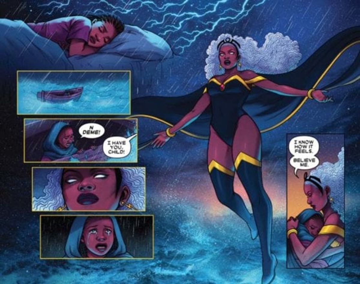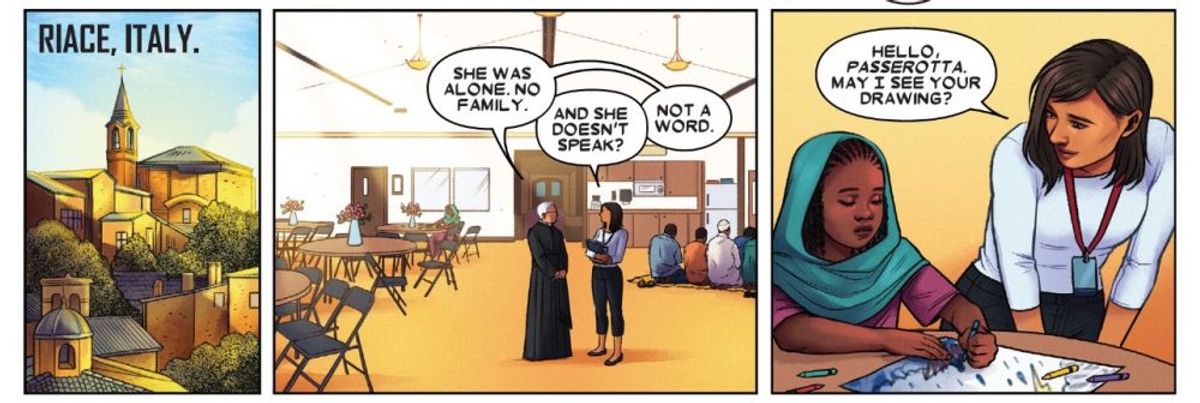 Il paese divenuto famoso in tutto il mondo per l'accoglienza dei migranti del Mediterraneo è al centro dell'episodio che vede protagonista una bimba scampata a un naufragio grazie all'intervento di Tempesta, alias Ororo Munroe, uno dei membri più amati degli X-Men, nonché tra i personaggi più iconici dell'Universo Marvel.La piccola non riesce a comunicare a causa del trauma subito, ma le illustrazioni della Bartel lo fanno molto bene al posto suo. In una vignetta, Tempesta, che condivide con lei le origini africane (essendo figlia di una principessa kenyota e di un giornalista statunitense), mentre la porta in salvo le sussurra, stringendola al petto:
