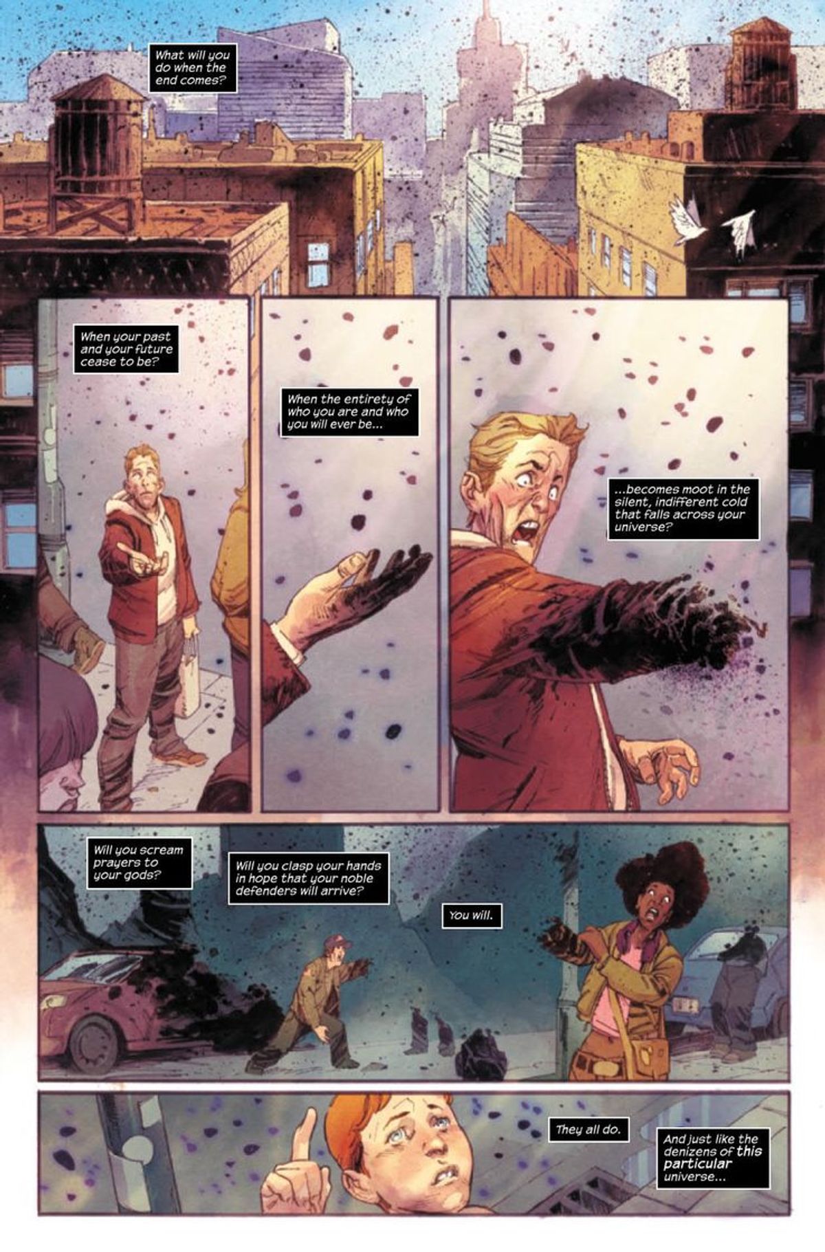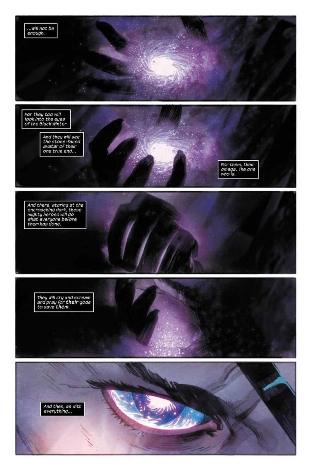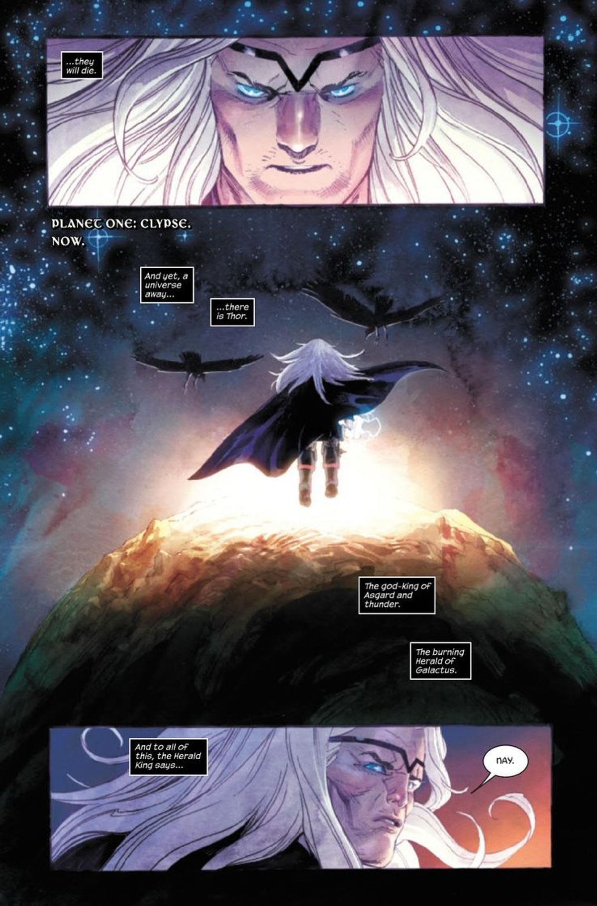 Come già dovreste sapere, dopo gli eventi della Guerra dei Regni il Tonante siede sul trono che fu di Odino, e nel suo nuovo ruolo di Padre di Tutti veglia sui Dieci Regni. Nel primo numero, Galactus è però piombato su Asgard annunciando l’avvento di una minaccia terribile: l’Invero Nero, la fine di ogni cosa. Dopo aver distrutto il cosmo originario del Divoratore di Mondi, questa potentissima entità ha preso di mira l'Universo Marvel e ora sta arrivando. Galactus ha dunque nominato il Dio del Tuono suo nuovo Araldo, conferendogli dei nuovi poteri.In queste ore, la Casa delle Idee ha diffuso un’anteprima del secondo numero della serie, in arrivo nelle fumetterie statunitensi il 29 gennaio, e grazie alle splendide tavole realizzate da Klein e dal colorista Matt Wilson possiamo vedere l’Invero Nero all'opera, mentre spazza via interi pianeti. Mentre le persone si dissolvono in una nuvola di polvere, però, un gruppo di eroi tenta invano di sventare l'inarrestabile minaccia: chi sono questi personaggi?