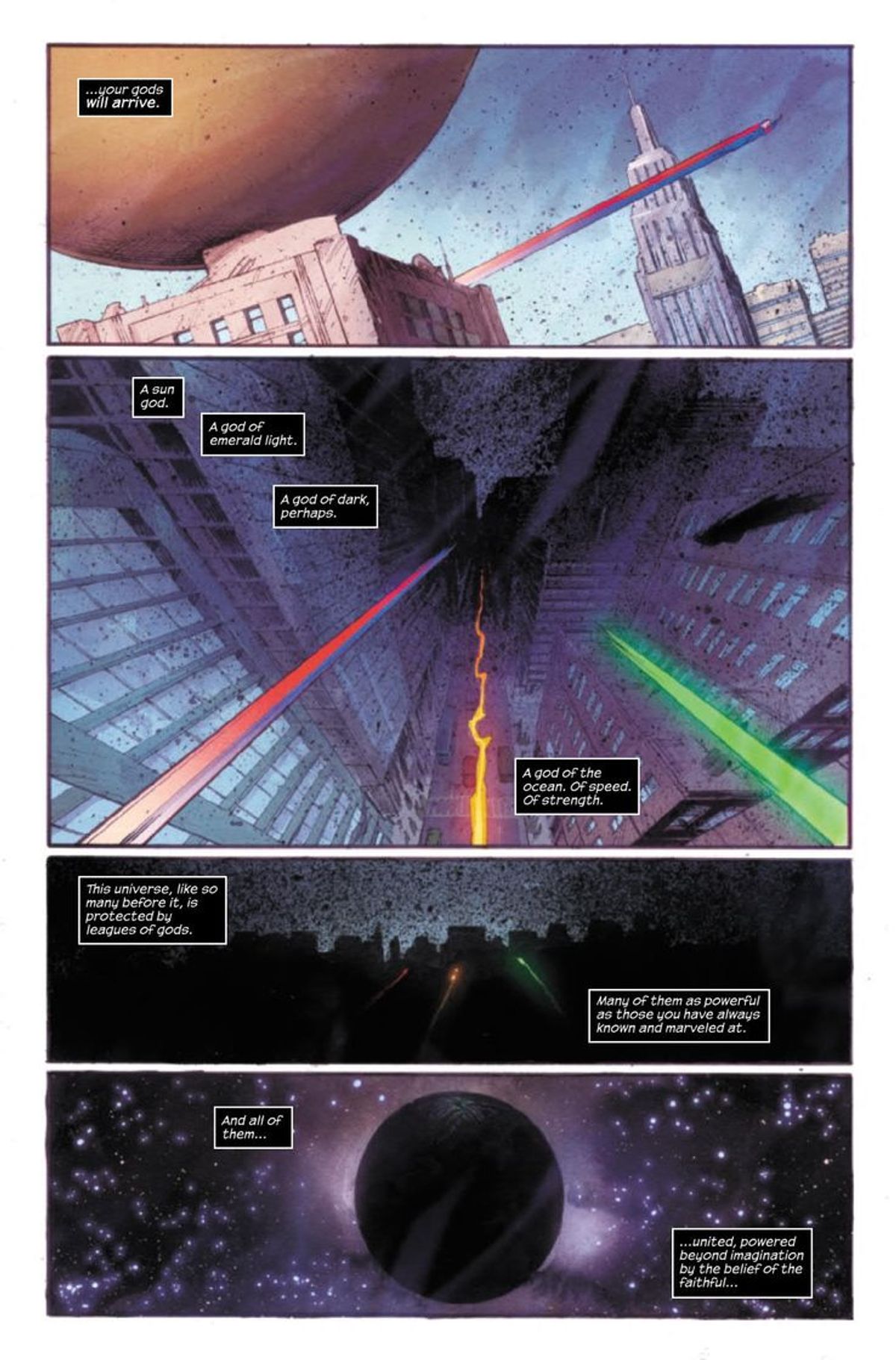 Le didascalie ce li presentano come "il dio del sole”, “il dio della luce smeraldo”, “il dio degli oceani, della luce e della forza”. Vediamo costoro sfrecciare per strade note, lasciando scie familiari e iconiche. Insomma, anche se non vengono citati per ovvi motivi, risulta evidente il riferimento a Superman, Batman, Wonder Woman, Lanterna Verde, Flash e Aquaman, membri della Justice League della DC Comics!Di seguito trovate la sinossi e una gallery con l’anteprima del numero #2 di Thor, scritto da Donny Cates per i disegni di Nic Klein: