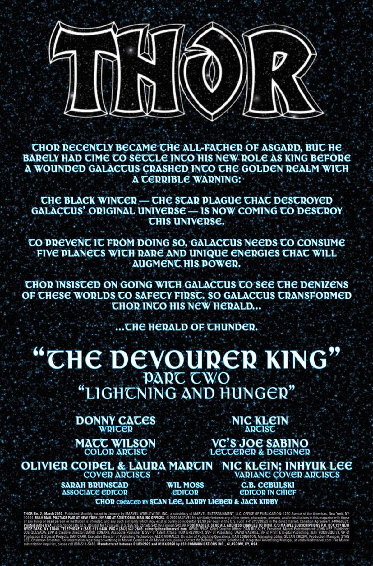 L’Invero Nero e il Re Divoratore! Dinnanzi a lui, l’Invero Nero; dietro, una scia di morte scaturita dalla sua stessa mano. Il Dio del Tuono sfreccia nel cosmo alla ricerca del potere per salvare Asgard e l’esistenza stessa. Ma nessun potere nei cieli potrà salvare un dio – un re – dal suo sanguinoso dovere.