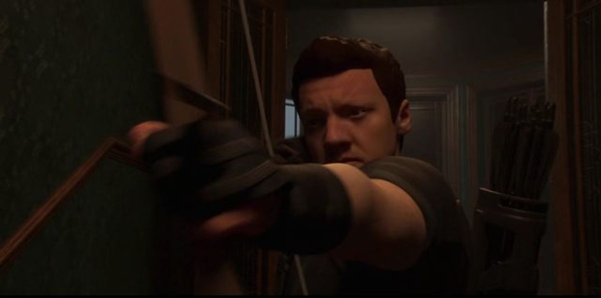 Occhio di Falco, in una sequenza di pre-visualizzazione, che difende Visione dagli Esternauti (Outriders).