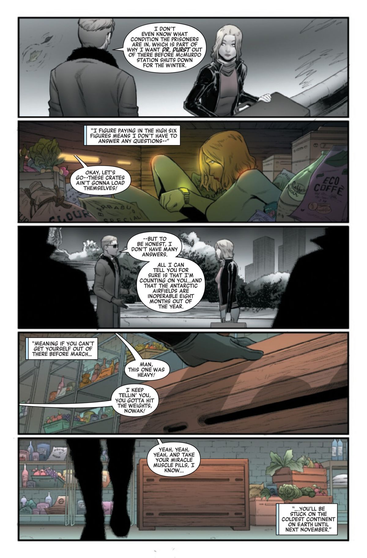 Grayson - Il Guardiano Rosso e Yelena si rincontrano, a livello metanarrativo, perché è in arrivo il film Black Widow. Sul piano della trama, invece, il loro incontro è casuale. La nostra sarà una storia di spionaggio che coinvolge Yelena per ragioni sfaccettate. Di base, lei ha accettato un incarico come indipendente: far evadere qualcuno da un'installazione segreta dello S.H.I.E.L.D. in Antartide.