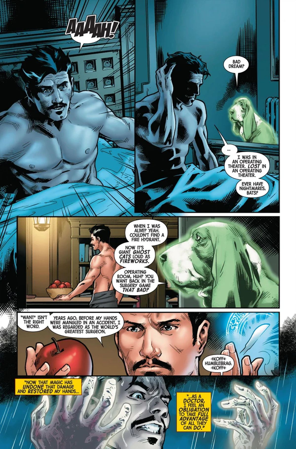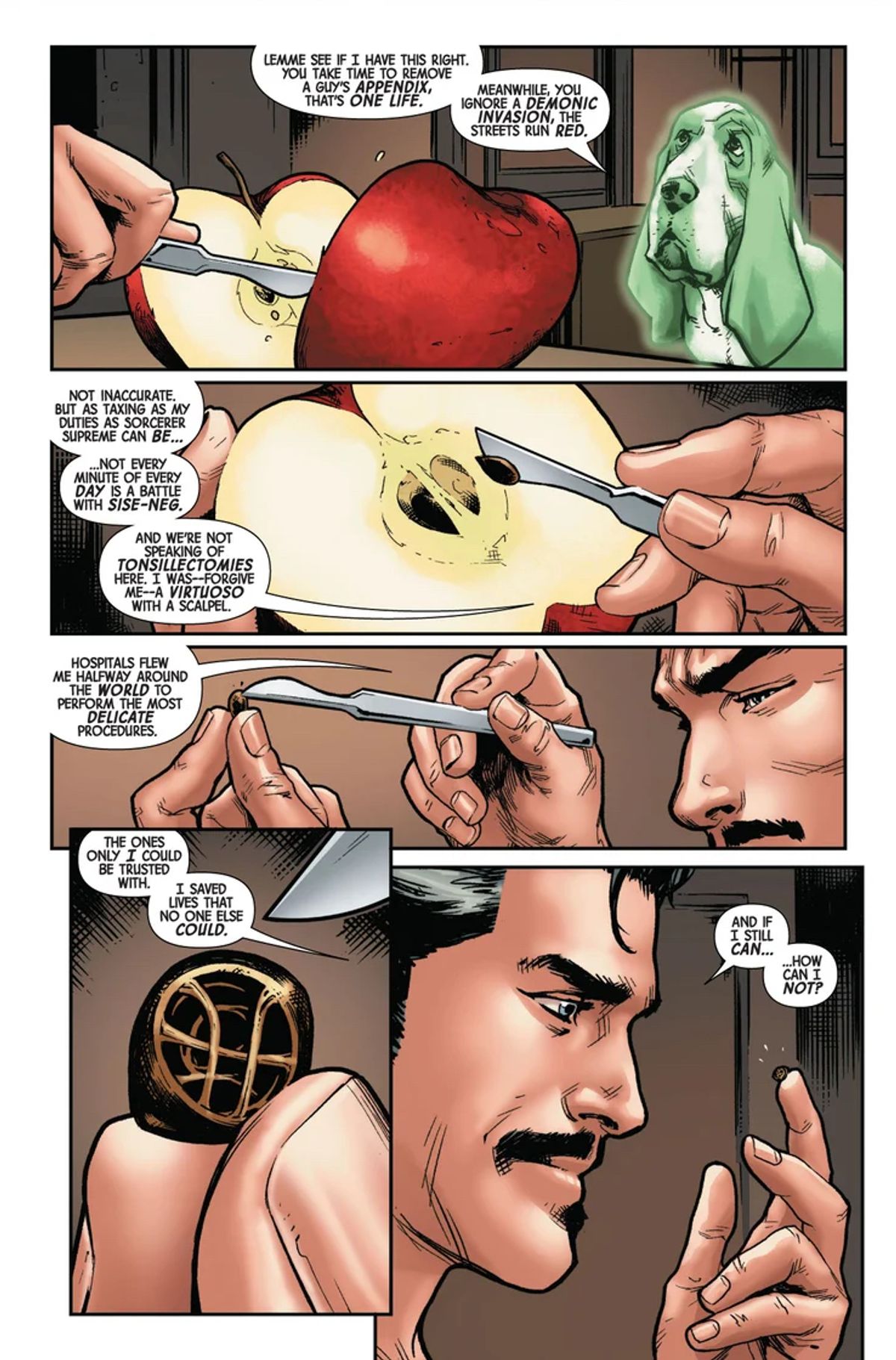 A quanto pare, il protagonista della serie sta per recuperare completamente l'uso delle proprie capacità, cosa che lo riporterà alla medicina... ma senza abbandonare i suoi impegni come Doctor Strange! Come se la caverà il Chirurgo Supremo? Ci auguriamo meglio del Veterinario Supremo delle splendide storie firmate qualche tempo fa da Donny Cates!