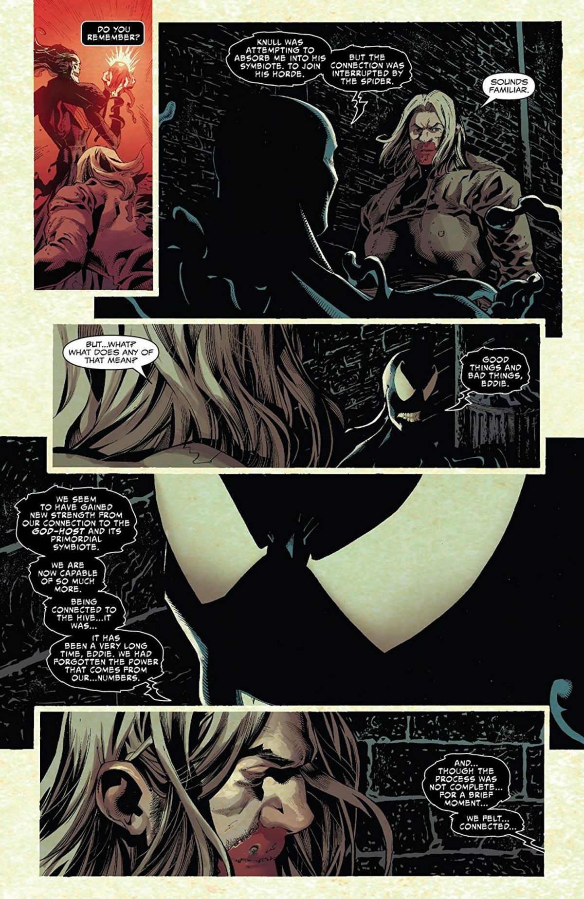 Tempo fa, vi abbiamo parlato delle diverse novità apparse finora nel fumetto, tra cui l'arrivo di Knull, il Dio dei simbionti, la cui esistenza riscrive le origini del legame tra la razza aliena dei klyntar e la Terra.Oggi vi parliamo invece della nuova capacità di Venom, probabilmente connessa alla stessa divinità: un paio di enormi ali che scaturiscono dal simbolo presente sulla sua schiena e che ricordano quelle di Knull.