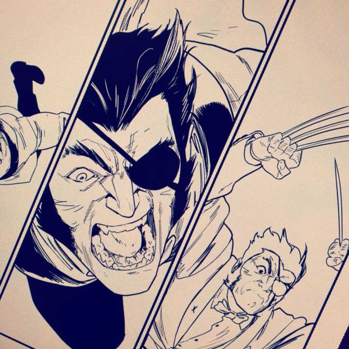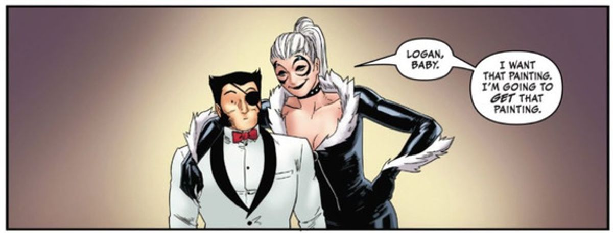 Per prima cosa abbiamo Wolverine come il Guercio. Disegnare Logan in smoking è stata un’esperienza inedita per me. Ho l’opportunità di disegnare Logan come un individuo di classe e riservato, nonché di giocare con la ridicola sospensione dell'incredulità implicita nel suo minimale travestimento, che in qualche modo nessuno riesce a svelare.Inoltre mi sono divertito a creare qualche variante per il costume della Gatta Nera. Felicia ha una personalità molto particolare, ama circondarsi di belle cose, non puoi farle indossare un costume qualunque, anche se solo per un breve periodo. Ne ho creato qualcuno, per poter aggiungere il mio tocco personale al personaggio.