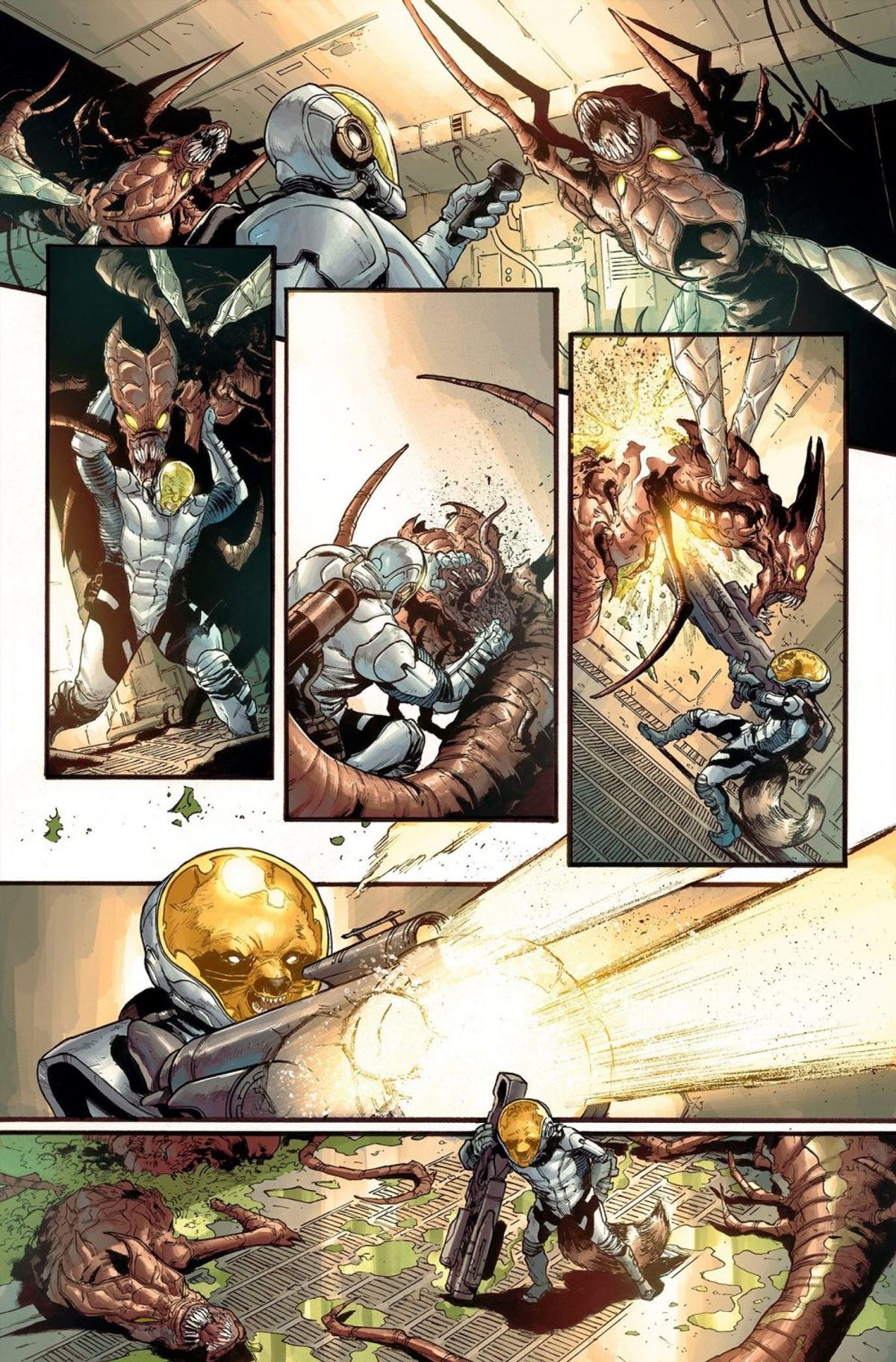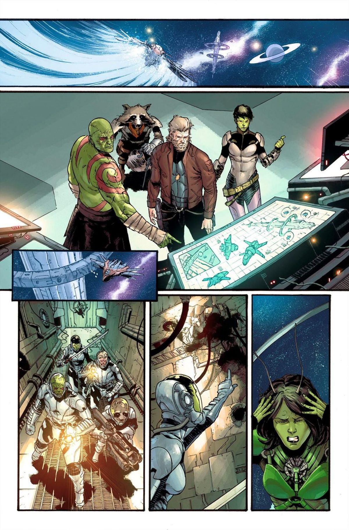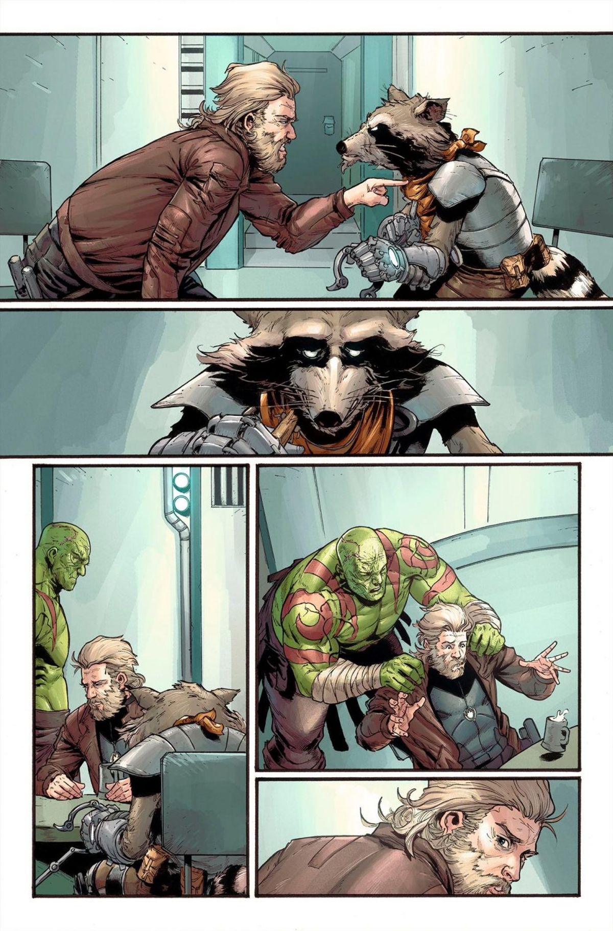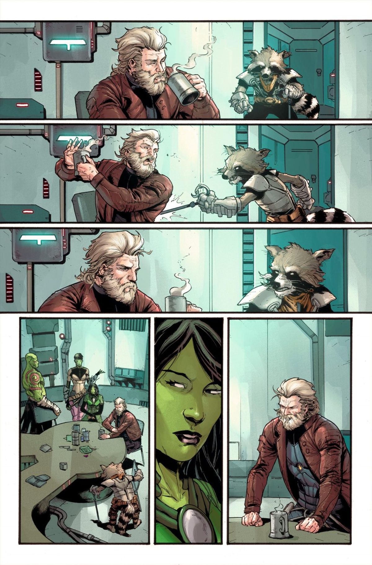 L'idea di piazzare Peter Quill in questo contesto è nata dai miei quesiti su dove diavolo fossero i Guardiani della Galassia quando il piano del Teschio Rosso per impadronirsi del mondo è entrato in azione. Ovviamente, lontano dalla Terra. E allora che cosa significa, per loro, apprendere la cosa dopo parecchio tempo? E come reagirebbero? Ovviamente, Peter è il più coinvolto, essendo nativo della Terra. Quel che amo di lui è che, sotto la sua spavalderia e la sua comicità, è un grande guerriero e leader. Mi piace l'idea di ridurlo in pezzi per poi rimetterlo assieme.C'è una chimica magica tra i Guardiani: sono una banda di esclusi che funzionano meglio insieme che separati. Anche se non lavorano assieme da un sacco di tempo. In particolare, mi sono divertito a scrivere Rocket e Gamora, perché il primo era la preziosissima chiave comica in un fumetto altrimenti molto oscuro e la seconda rappresenta il collante di controllo e abilità che tiene assieme tutto il gruppo.