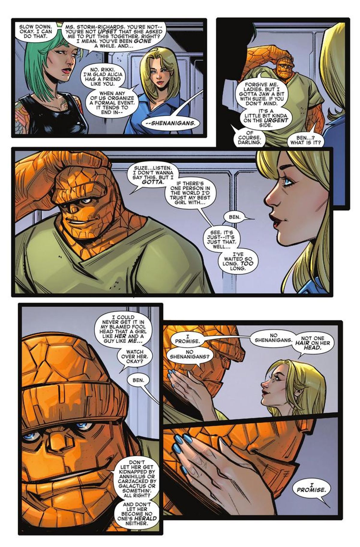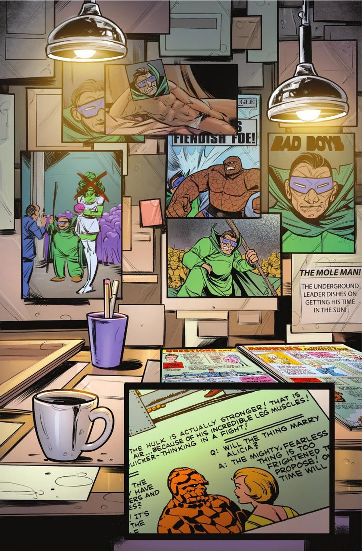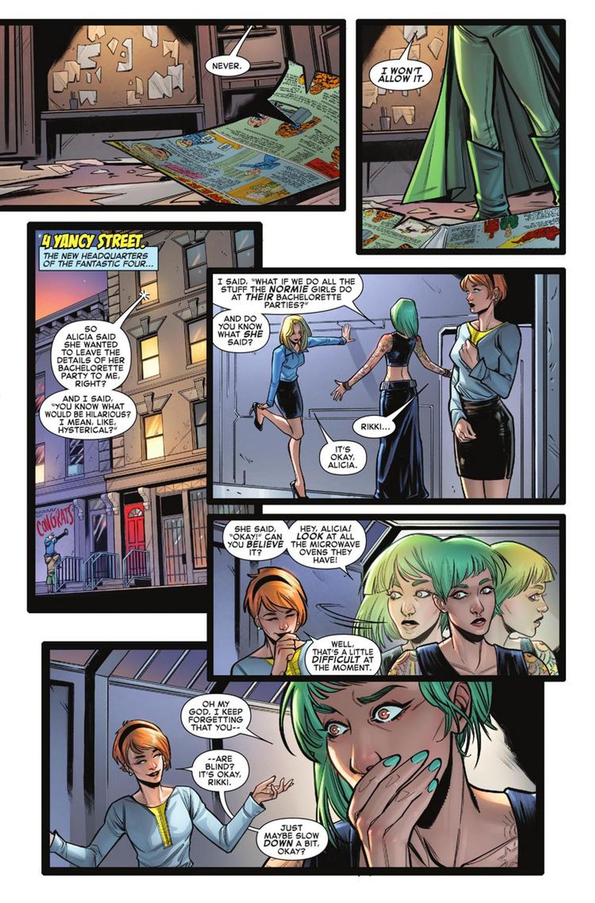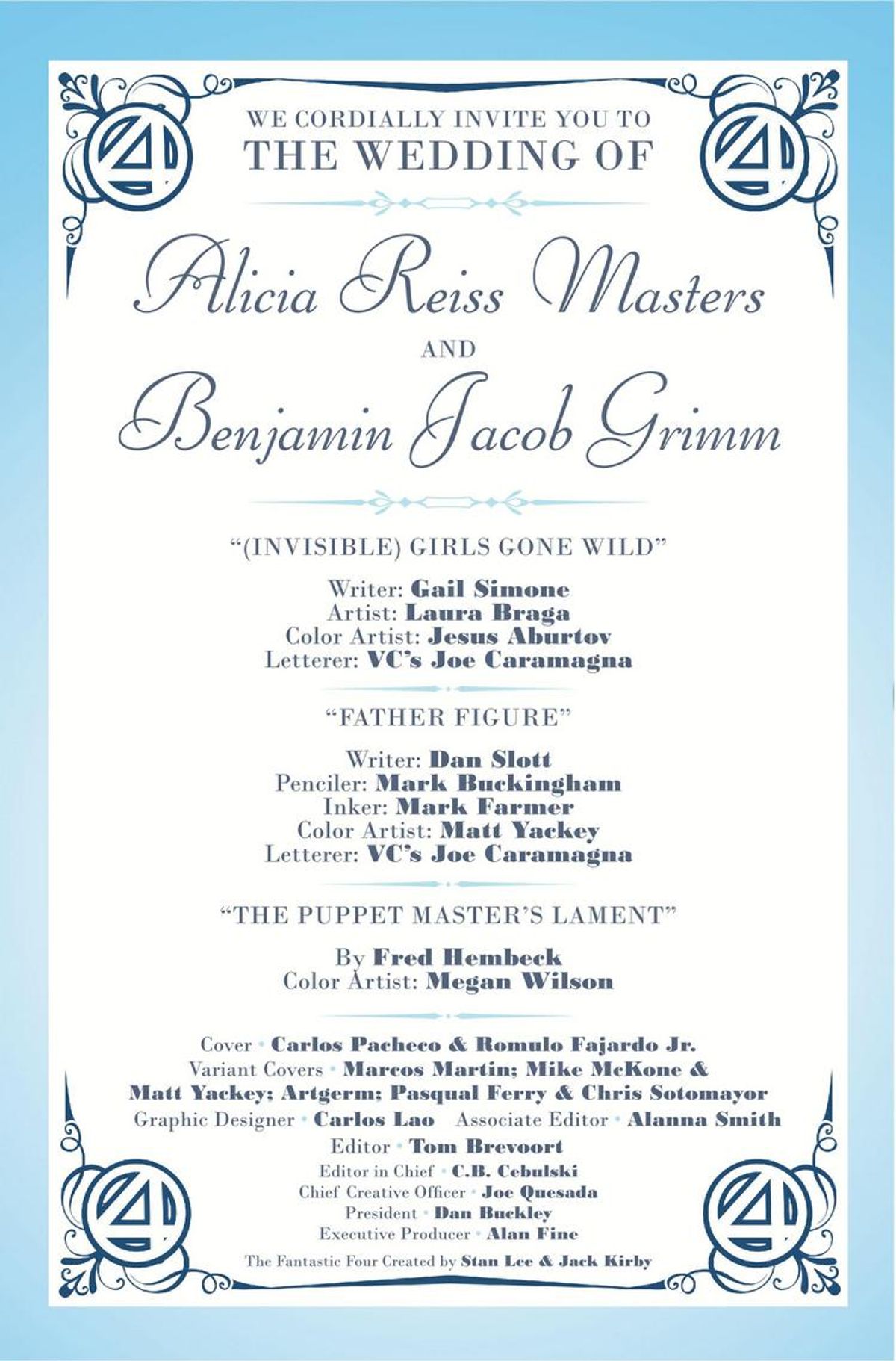 Venite a celebrare le imminenti nozze della Cosa e di Alicia Masters con una festa come solo la Prima Famiglia del Fumetto saprebbe fare! Ospiti speciali: She-Hulk, Medusa, Crystal e altre ancora, per l’addio al nubilato che Alicia non si aspetterebbe mai, la cui baldoria sarà interrotta dall’arrivo di un super criminale a sorpresa (e, no, non parliamo di Johnny Storm)! Nel frattempo, la Cosa ha un inatteso incontro con il suo futuro suocero, il Burattinaio! In più, Hembeck! L’albero genealogico dei Fantastici Quattro!