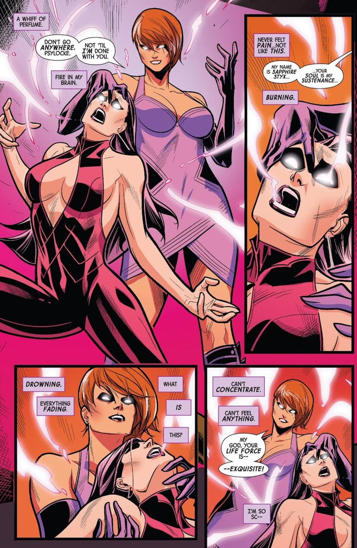 Gli eventi successivi hanno visto Sapphire sostanzialmente sovraccaricarsi e perdere il controllo dei propri poteri. Chissà se questo sarà tra le cause dirette del ritorno di Psylocke nel corpo originale di Elizabeth Braddock, dopo tanti anni passati in quello della letale ninja Kwannon.