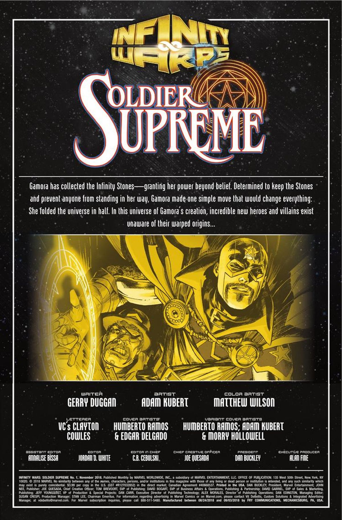 Soldier Supreme vedrà la sua conclusione il 24 ottobre con il secondo e conclusivo numero. La copertina del primo è realizzata da Humberto Ramos, mentre la successiva sarà firmata da Giuseppe Camuncoli. Una curiosità, a questo proposito: la cover di Ramos ha ricevuto un'evidente modifica in corso d'opera, l'aggiunta di un paio di baffi assenti nella prima versione.Di seguito trovate la sinossi e un'anteprima di Infinity Warps: Soldier Supreme #1: