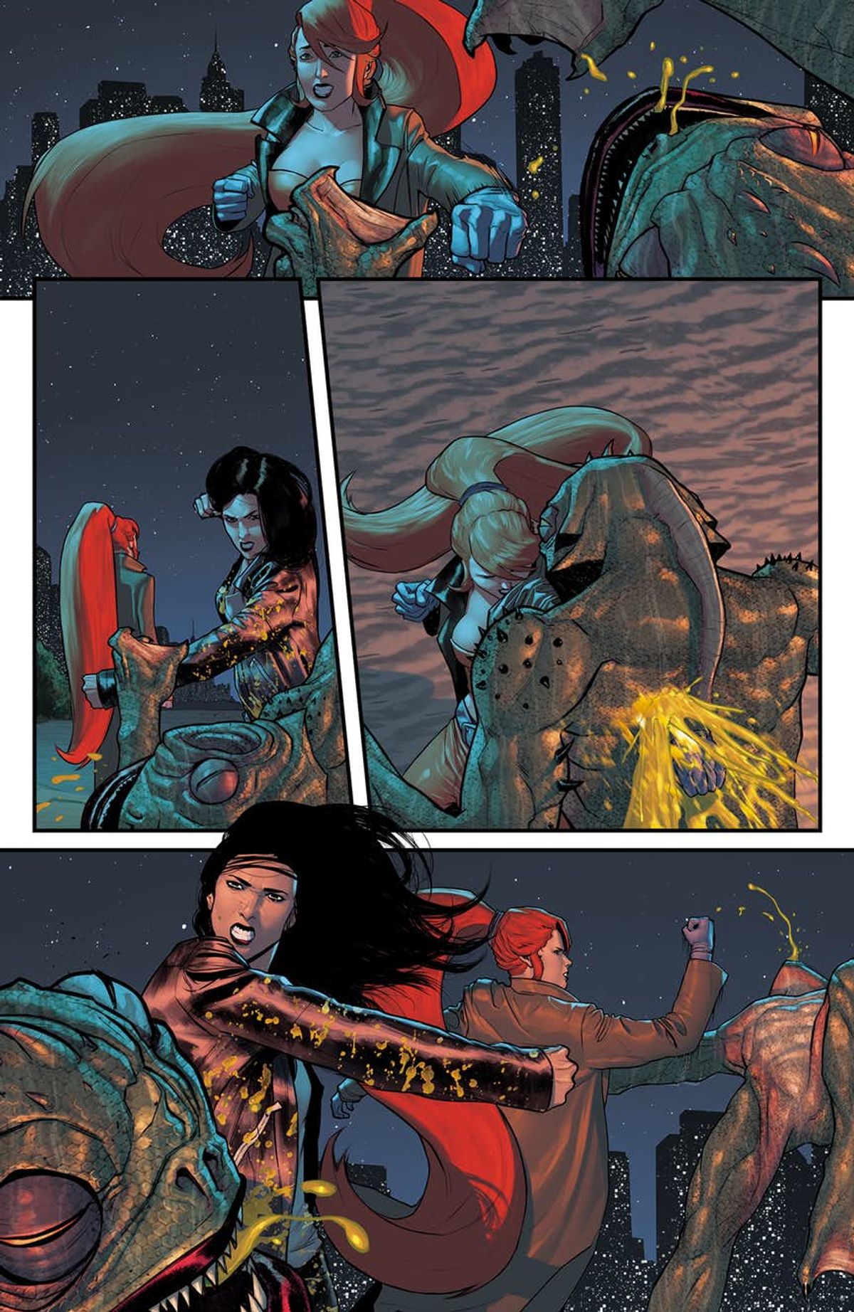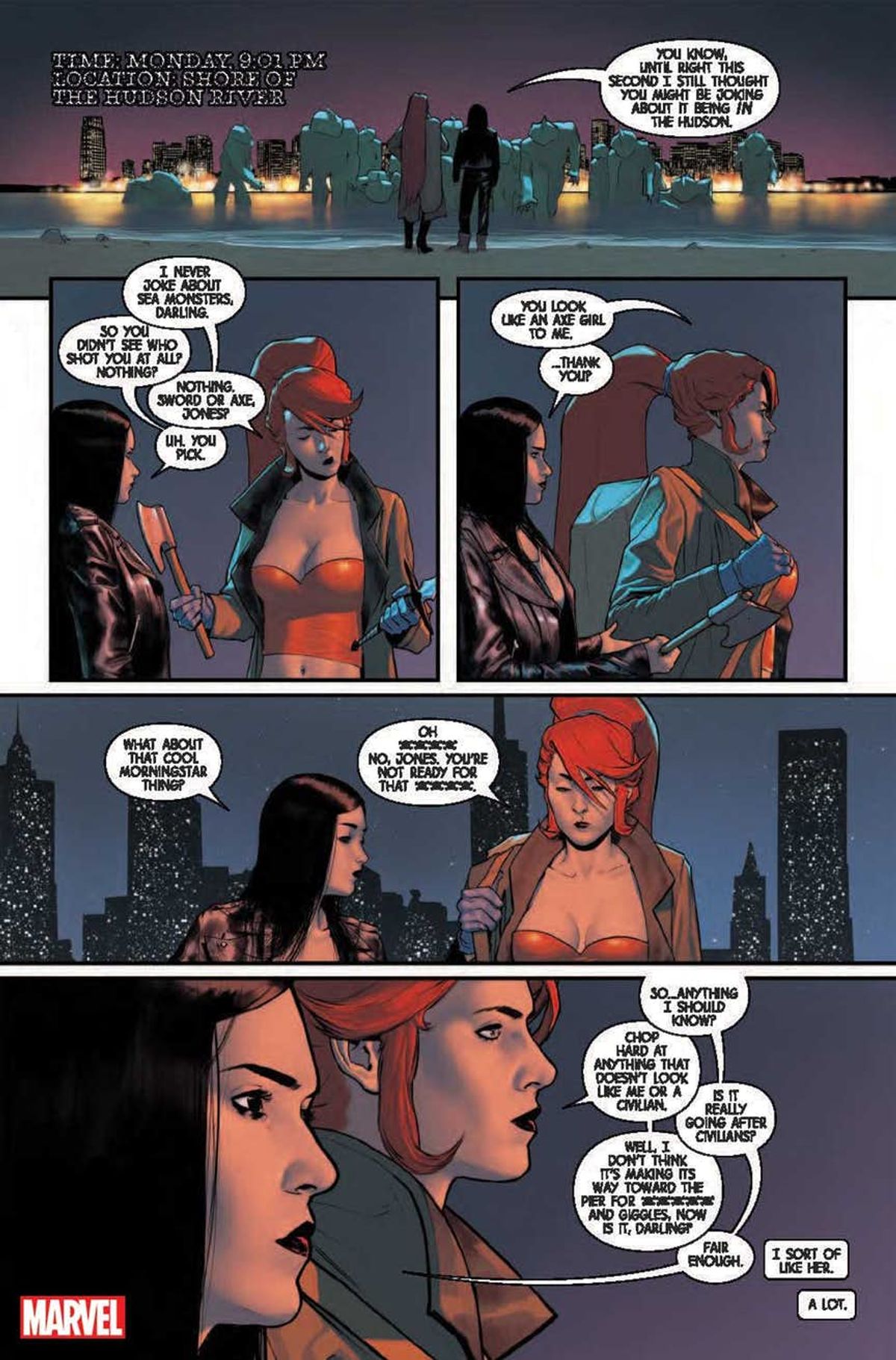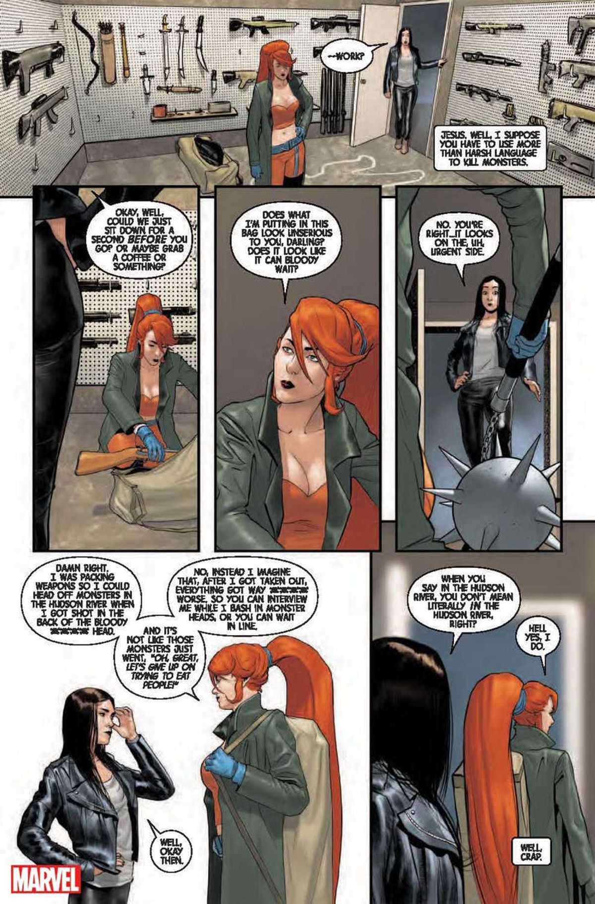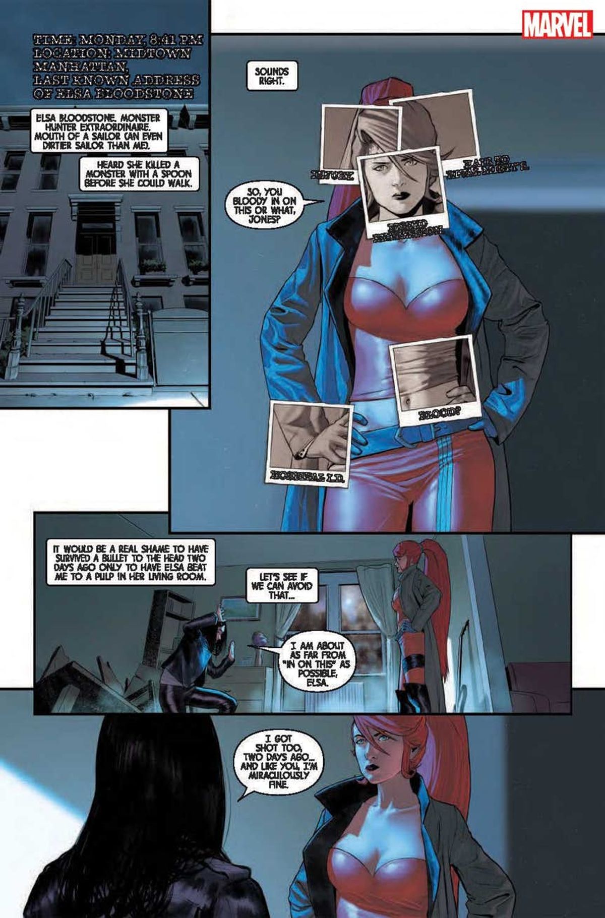 Tendo a credere che una delle cose grandiose degli investigatori privati sia che conoscono tutti, e che tutti, in qualche modo, sono in debito con loro. La sensazione che ogni cosa sia connessa è parte di ciò che rende il loro mondo affascinante. Mi piace davvero un sacco Elsa Bloodstone. La infilerei in ogni storia. Ma ho dovuto sudarmela con i piani alti per includerla in Jessica Jones, perché non è che sia proprio il personaggio ideale per le sue storie.Il che è esattamente il motivo per cui la volevo così tanto. Che cosa ci fa un folle personaggio sopra le righe e cacciatore di mostri come Elsa Bloodstone, con il suo metro e mezzo di capelli rossi, con i suoi pugnali, dentro una storia metropolitana e di criminali? Jessica ed Elsa condividono una scena nel numero #2, che è in assoluto la mia preferita. Un interrogatorio decisamente non convenzionale che credo piacerà molto ai lettori.