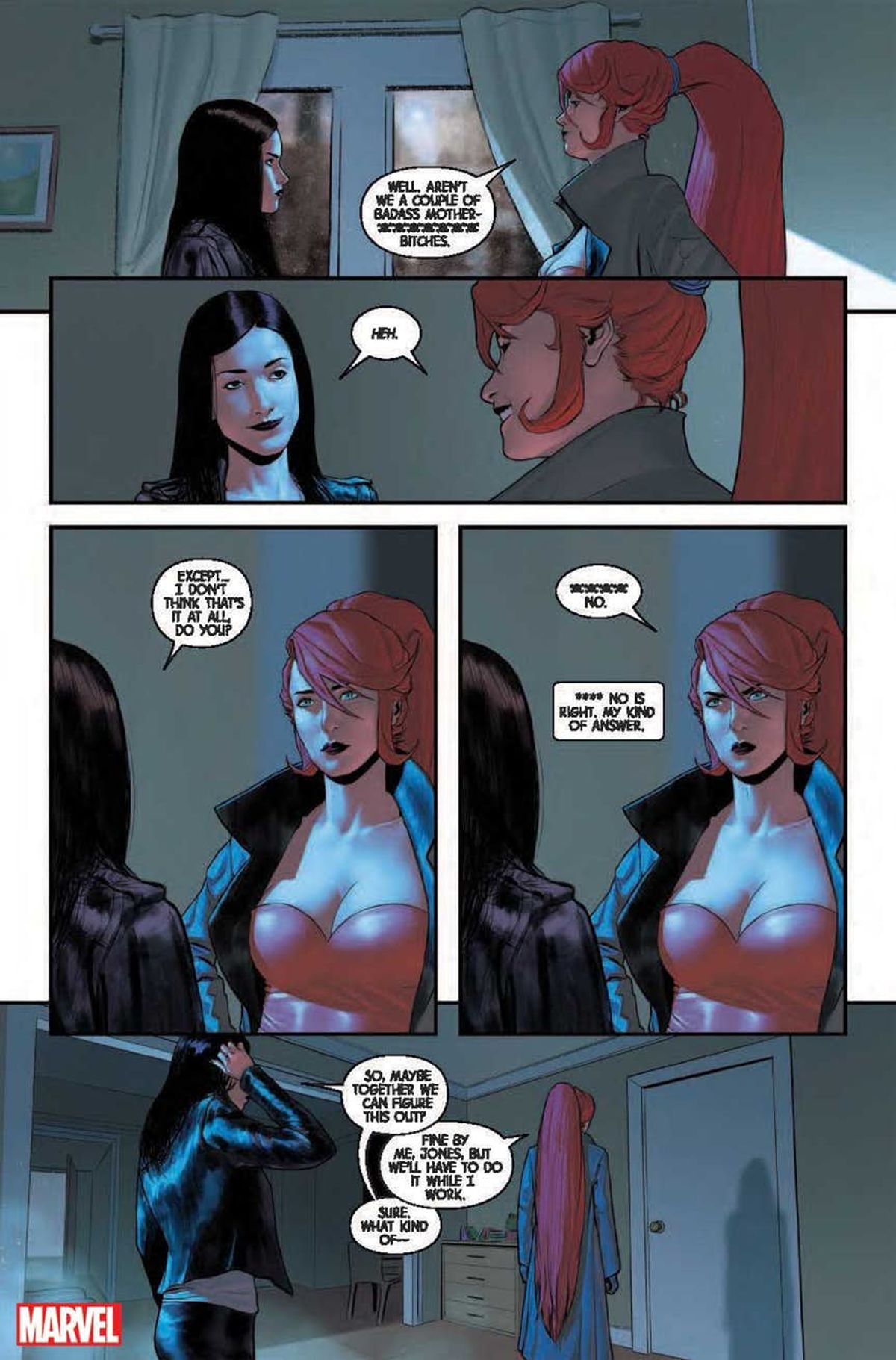 Per quanto riguarda l'ambientazione e i toni, mi sono innamorata di Kate Bishop e della sua Los Angeles neo-noir. Abbandonarla è meno doloroso, dato che mi rimane West Coast Avengers, ma tornare ad avventure hard boiled a New York, con Jessica, è incredibilmente bello.Sono una grande fan di Luke Cage, così come del loro matrimonio, uno dei pochissimi che dura da tanto tempo. Sono sexy e divertentissimi insieme. La loro dinamica è incantevole. Mi sono divertita a esplorarla, anche se a piccole dosi. Dato che questa è la serie di Jessica, Luke non appare nel secondo numero, ma farà un importante ritorno nel terzo. E ci sarà anche nella "seconda stagione" della storia.