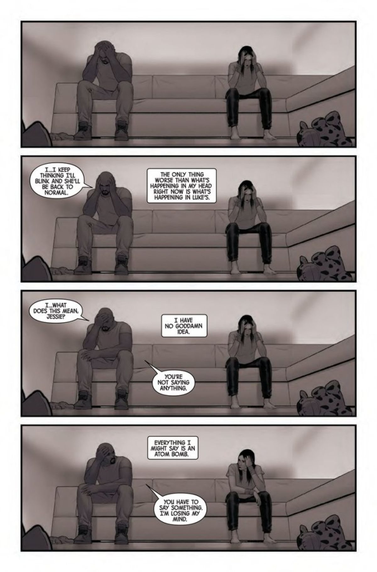 È stata proprio la sceneggiatrice a diffondere, tramite il proprio account di Twitter, le prime immagini del fumetto:La Marvel non ha diffuso l'anteprima della seconda stagione di Jessica Jones. Quiiindi lo farò io. Ecco quattro pagine dall'uscita di domani. Doppia foliazione - 40 pagine a 5 dollari - come la stagione 1. Solo in digitale (ma seguirà la versione in volume). Disegni e colori di Mattia De Iulis.