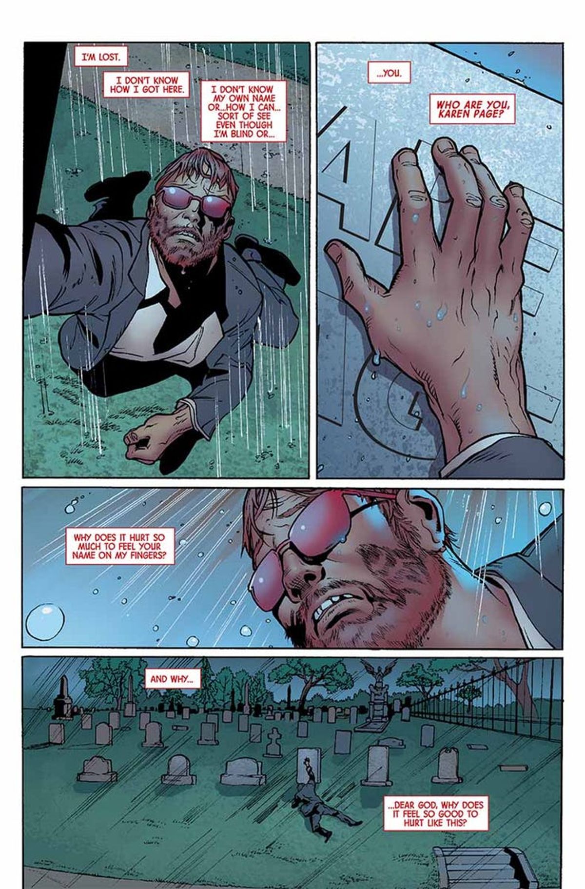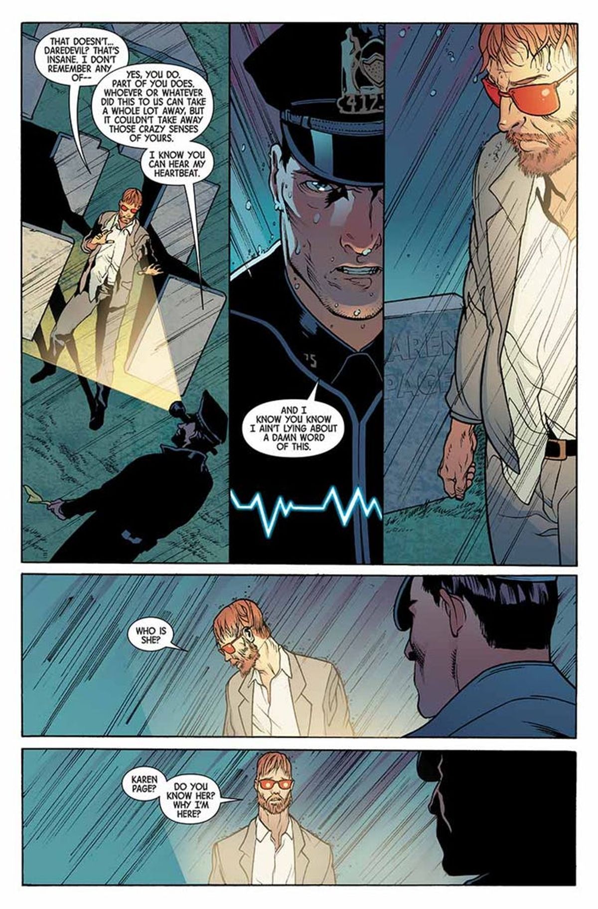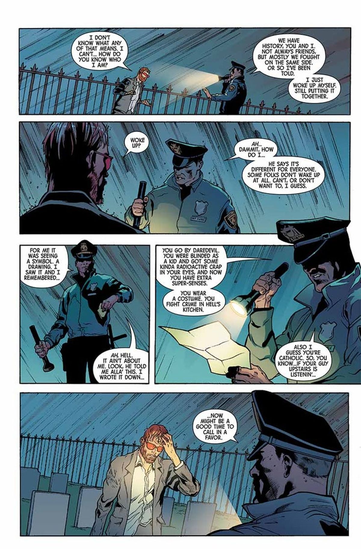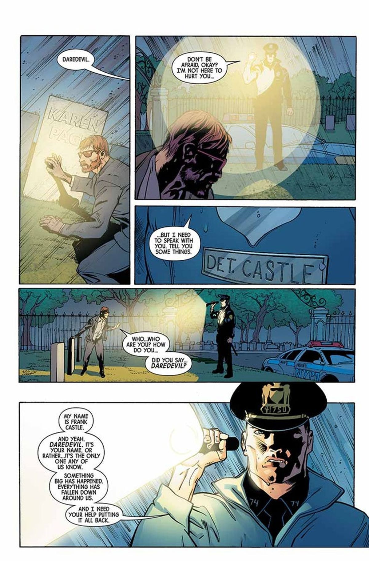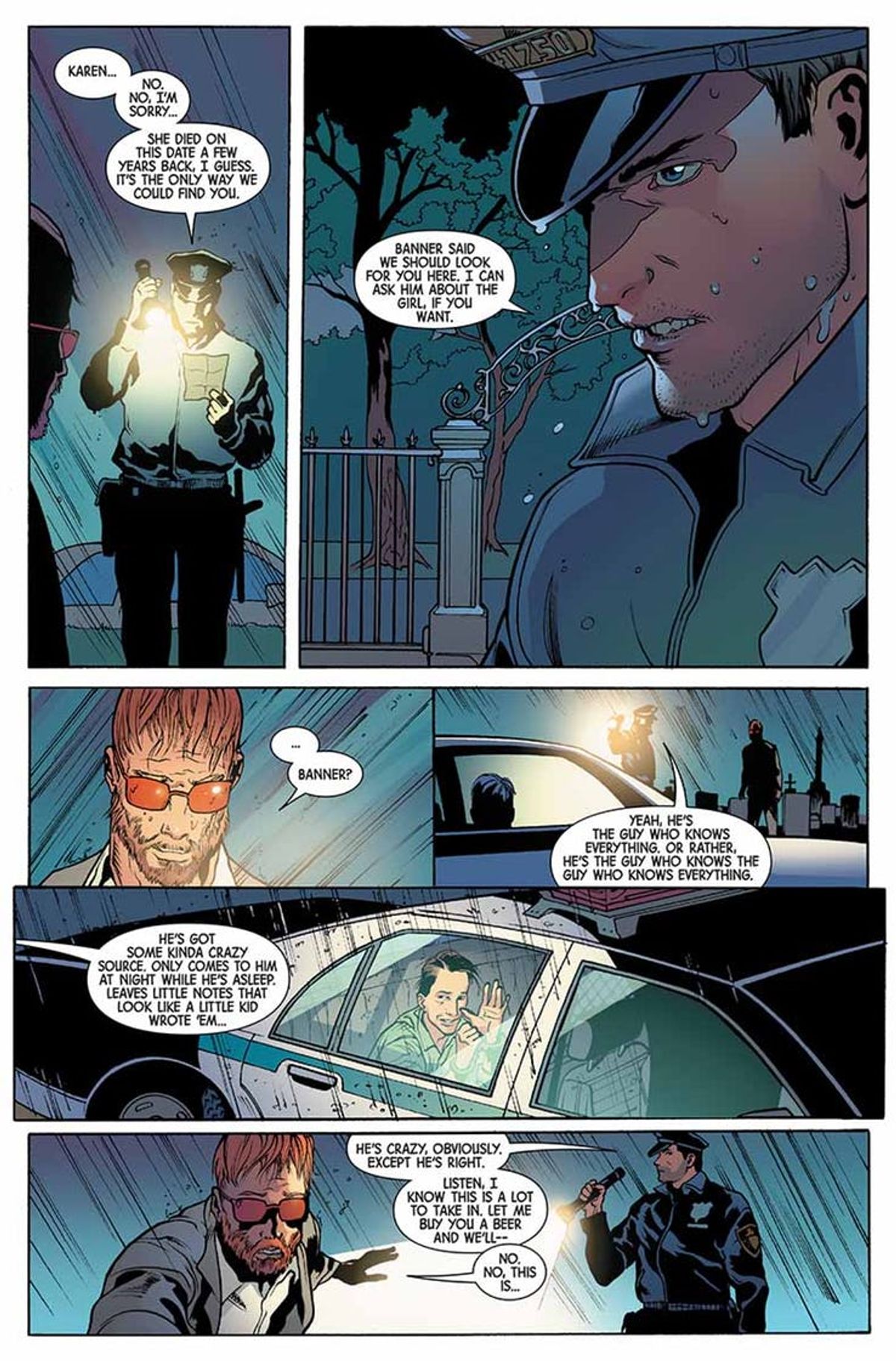 Dopo avervi riportato tempo fa le parole dello stesso Cates, sceneggiatore dell'albo d'apertura, oggi vi presentiamo alcune tavole di Marvel Knights 20th #1 disegnate da Foreman e Derek Fridolfs per i colori di Matt Milla, accompagnate dalla sinossi dello spillato:Per celebrare la leggendaria etichetta fondata dal CCO Marvel Joe Quesada, un nuovo gruppo di talenti è pronto a raccontare una storia rivoluzionaria che attraversa l'Universo Marvel! Nel cimitero, l'uomo cieco non sa chi sia o perché in quel momento sia giunto davanti a quella tomba in particolare. Non conosce il robusto poliziotto che lo ha avvicinato e che racconta una strana storia. E nemmeno l'uomo decisamente bizzarro che siede sul sedile posteriore della volante con i suoi occhi verdi lampeggianti. Ma tutto ciò sta per cambiare.