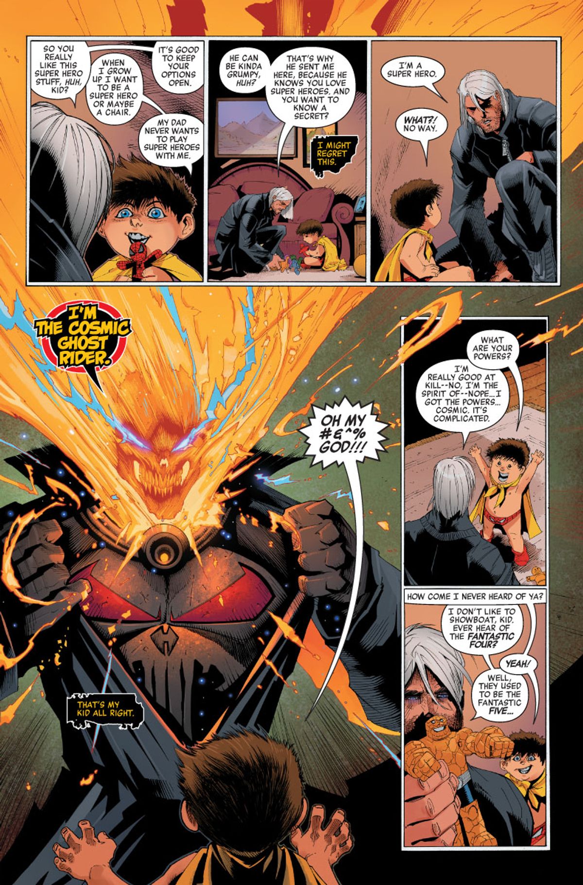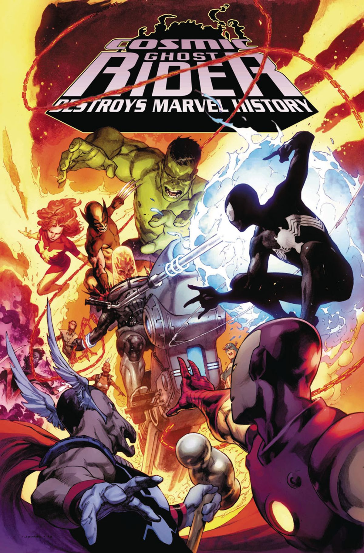 Dopo essere tornato indietro nel tempo per tentare di uccidere Baby Thanos, il Ghost Rider Cosmico è rimasto bloccato nel passato; in questa nuova storia, dunque, assisterà alle origini dei più celebri eroi Marvel. Nel corso del primo albo vivrà la nascita dei Fantastici Quattro, ma in seguito avrà a che fare anche con Spider-Man, Jean Grey (rispettivamente nel secondo e terzo numero della miniserie) e Capitan America.In chiusura vi presentiamo la sinossi e un'anteprima di Cosmic Ghost Rider destroys Marvel History #1, oltre a diverse variant cover, firmate da Rob Liefeld, Carlos Pacheco, Jerome Opena, Greg Horn, Ron Lim e Clayton Crain.