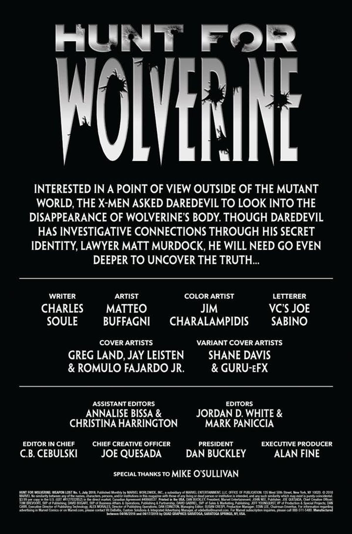 È uscito negli Stati Uniti il primo numero di Hunt for Wolverine: Weapon Lost, una delle quattro miniserie che racconteranno del ritorno di Logan nell'Universo Marvel, a seguito della dipartita avvenuta ormai quattro anni fa sulle pagine di La morte di Wolverine e della resurrezione ufficializzata su Marvel: Legacy (disponibile in fumetteria da qualche giorno).