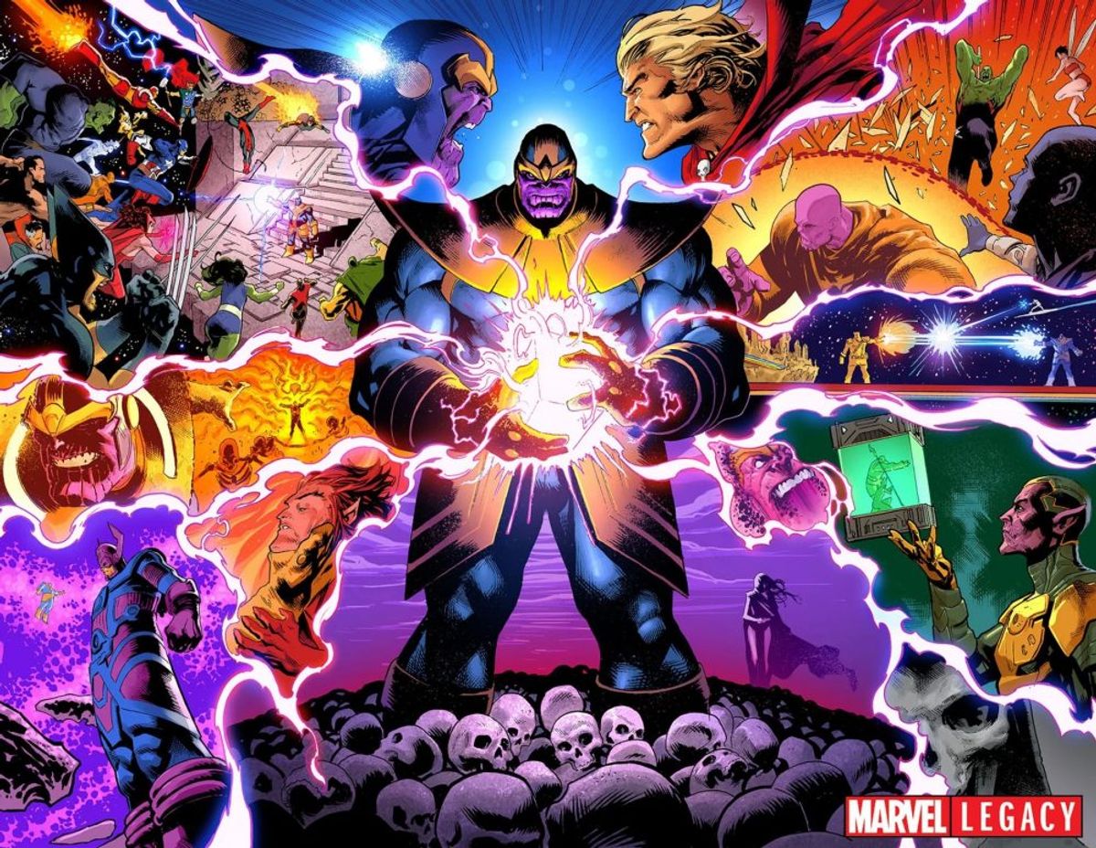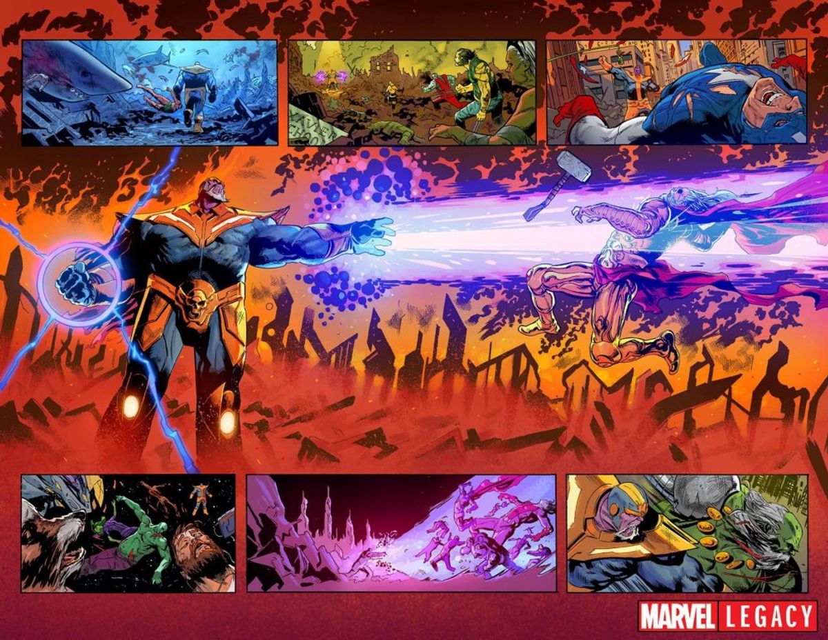 Cates - Io e Geoff lavoriamo assieme stabilmente da circa cinque anni e siamo diventati amici nel frattempo. Quindi, durante una chiacchierata notturna, ho finito per raccontargli l'intera trama che avevo in mente e agganciarlo. Alla fine della conversazione, era incredulo che mi lasciassero raccontare una cosa del genere e voleva assolutamente disegnarla. Il resto è storia.Shaw - Thanos vince, ma la vittoria non è mai semplice come sembra, né gratificante come ci aspetteremmo. L'idea di trionfo di Thanos è sempre stata piuttosto problematica, quindi la prospettiva di vederlo riuscire porta con sé un sacco di ramificazioni e conseguenze piuttosto spettacolari. Nessuna delle quali è semplice.