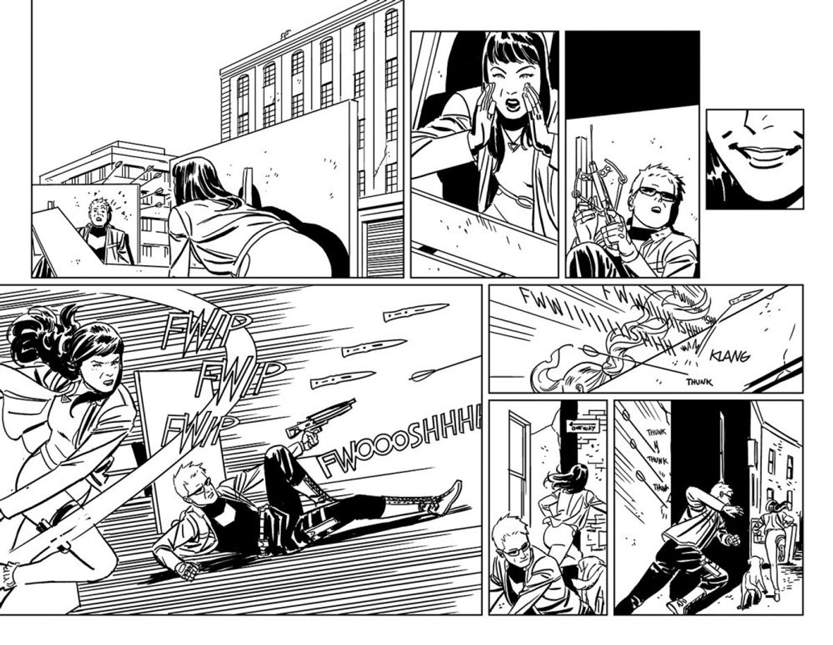 Architettare le scene d'azione è sempre una sfida notevole. Entrambi gli Occhio di Falco affrontano le situazioni usando quello che possono e in moltissime occasioni il mio lavoro diventa quindi non solo progettare l'azione ma soprattutto l'ambiente in cui si svolge. In maniera che tutto ciò che servirà si trovi al posto giusto.Il personaggio di Eden è già apparso nell'albo targato Generations nella versione più giovane di se stesso. Creare il suo look per la linea temporale presente è stato come prendere il concetto originario del personaggio (capelli blu, poteri fulminanti e tutto il resto) e immaginare come sarebbe ai giorni nostri. Ho passato in rassegna un sacco di cattivi della Marvel e altrettanti eroi per poi dar vita a qualcosa di personale.