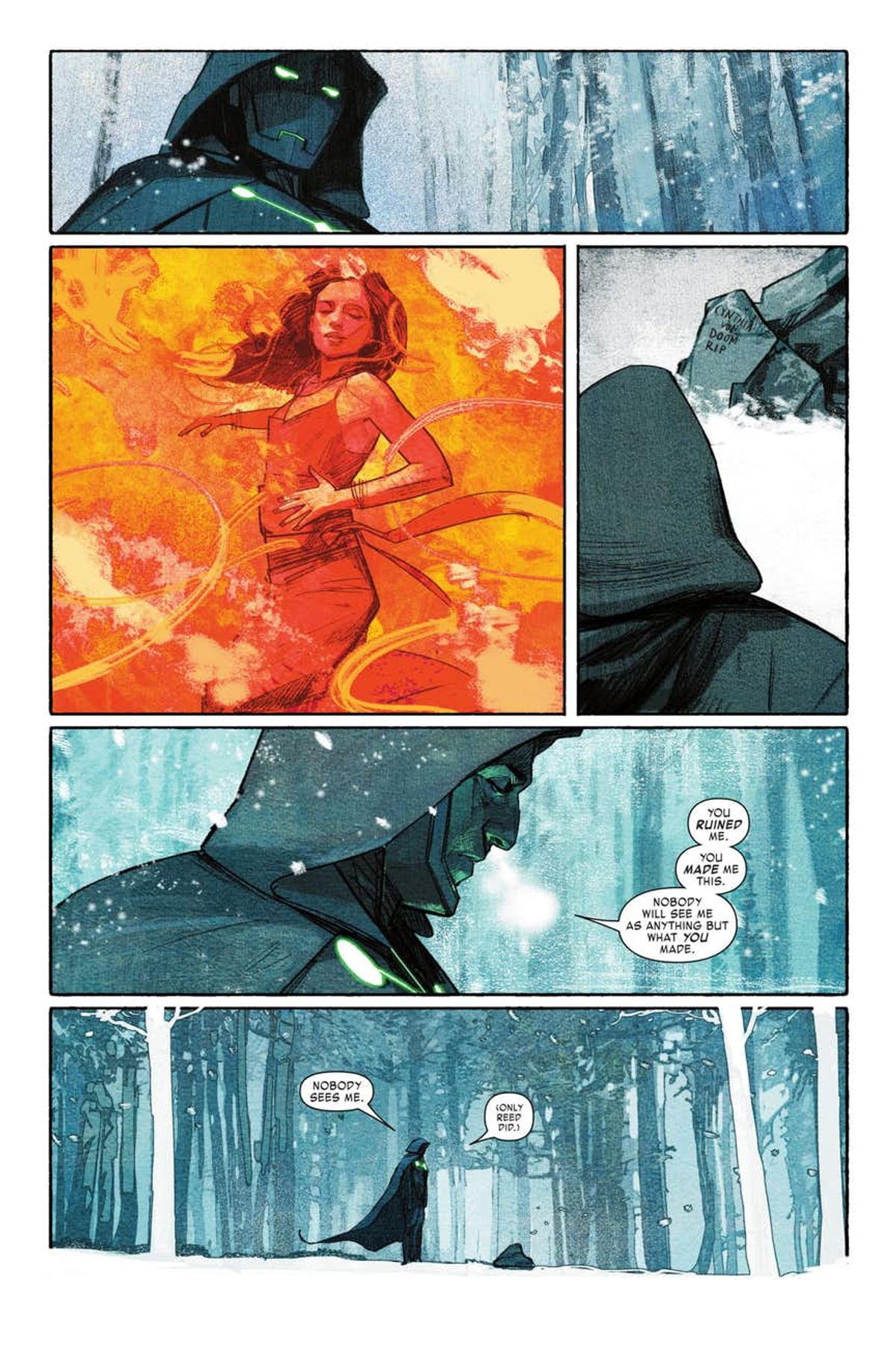 Nelle prime immagini di Invincible Iron Man #597 diffuse dalla Marvel (che trovate in coda al pezzo), sembra che l'ex Dottor Destino stia per fare un salto a Latveria, non tanto per onorare la memoria della madre Cynthia Von Doom, bensì per riconsiderare del tutto il loro rapporto dopo quanto accaduto sulle pagine della serie Infamous Iron Man: dapprima vediamo Victor accusare la donna di essere responsabile della sua condizione e poi fare addirittura a pezzi la sua tomba! Un cambio di atteggiamento notevole, considerando che Destino ha sempre avuto una sorta di venerazione per lei.Vi ricordiamo che Cynthia era in grado di praticare la magia, fornita dal demone Mefisto per ribellarsi agli oppressori, al prezzo della sua anima; in seguito alla sua morte, la maga divenne dunque prigioniera del demone, ma venne liberata dallo sforzo congiunto del Dottor Destino e Doctor Strange nella storica graphic novel Trionfo e Tormento.