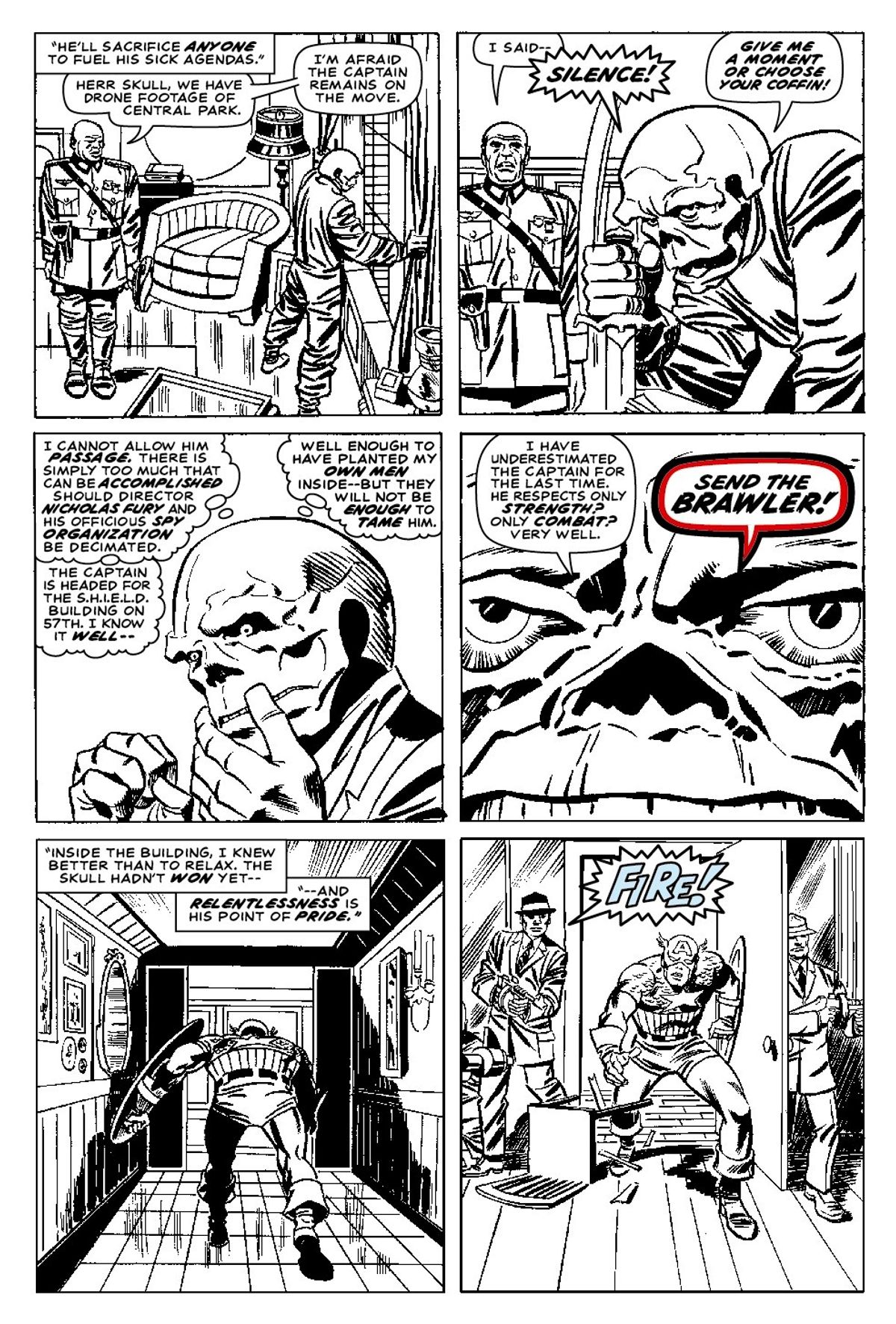 Il terzo passo è stato scegliere ulteriormente all'interno del loro materiale disponibile, alla caccia di vignette che avessero dei balloon e delle didascalie che non coprissero elementi importanti dello sfondo e che non ci obbligassero quindi a un lavoro eccessivo di adattamento. Non volevo semplicemente cancellare i dialoghi e sostituirli. In quel caso, avrei dovuto non solo riscrivere le parole, ma anche trovare vignette perfette da accoppiare tra loro. E quel che volevo fare era già abbastanza difficile da sé.Quarto passaggio: ho dovuto fare una ricognizione delle pagine già esistenti, prendere appunti dettagliati, farmi un'idea di quale storia poteva essere raccontata con il materiale a disposizione. C'erano un sacco di pagine in cui Cap combatteva cattivi moderni nelle strade e nei palazzi di New York. Supponiamo che Cap stia correndo in giro per Manhattan, affrontando una qualche trappola del Teschio Rosso. Per quali ragioni? C'erano alcune vignette che potevo usare, con scienziati in laboratorio. Forse Cap cercava qualcosa da loro? Come dare coerenza a questo materiale?