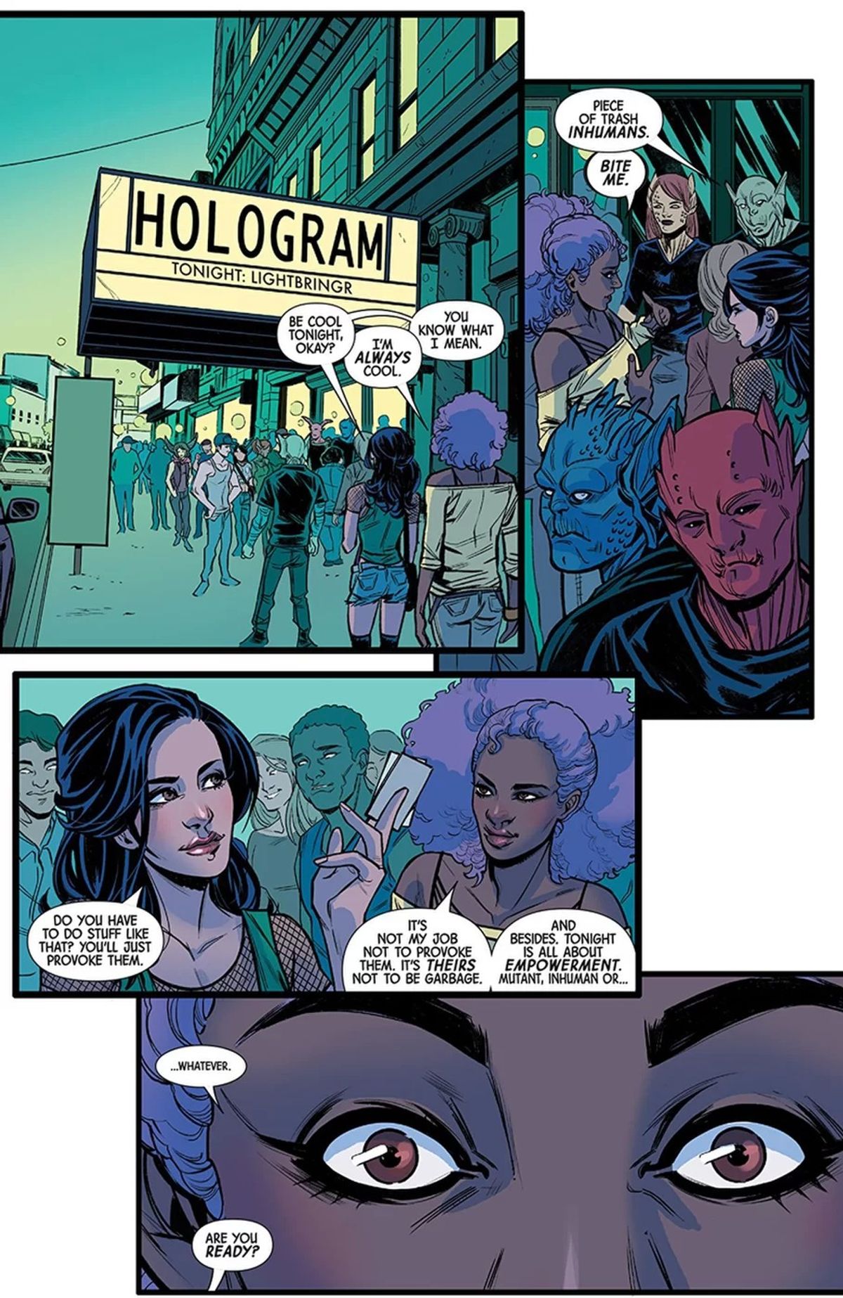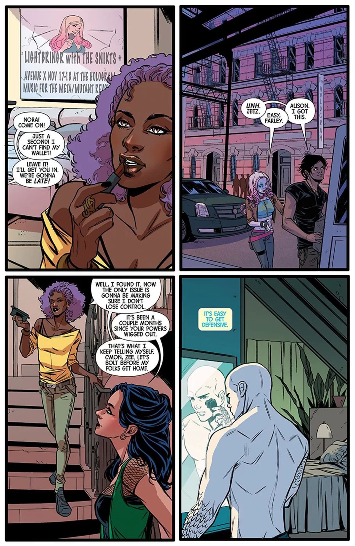Lasciatemi dire che non credo che questo nuovo fumetto sia punk nello stesso modo in cui lo è Kim & Kim. La definizione stessa di punk è stranissima, perché la parola può essere usata in tanti modi diversi, fino a perdere il suo significato originario. Kim & Kim è punk in senso estetico, ha quell'atteggiamento sfacciato, brillante e incazzato. Dazzler: X-Song è una cosa molto diversa, e qui Alison Blaire ha sicuramente un look simile a quelli che vediamo su Kim & Kim, ma non lo stesso animo aggressivo.
