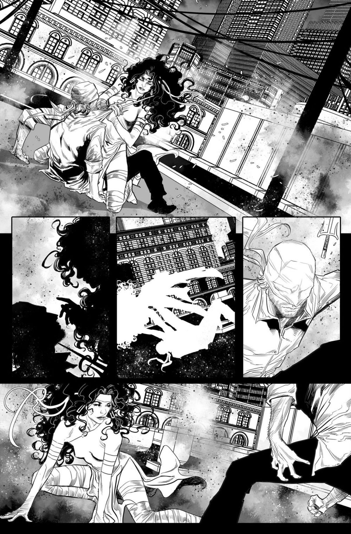 Come dicevo, è il mio ritorno sulla testata, e per l'occasione Chip ha deciso di presentare la nostra versione di Elektra, la letale assassina creata da Frank Miller. Per lei ho scelto lo stesso approccio che ho utilizzato con Matt e Kingpin: un ritorno alle origini. Ho ripreso il primo costume, quello disegnato da Miller, e poi ho rivisitato quello realizzato da Bill Sienkiewicz. L'unica cosa che ho cambiato è la bandana sulla sua testa: volevo assolutamente disegnare Elektra con i capelli ricci, come fece John Romita Jr. ne L'uomo senza paura. Quindi, ho optato per un'unica fascia attorno alla testa. Spero piacerà ai fan.Riguardo a Matt, ho scelto di vestirlo in modo più casual. Nel secondo capitolo, il disegnatore ha utilizzato un look classico, così per lo scontro con Elektra l'ho immaginato senza la giacca e con le maniche arrotolate. Chip ha assolutamente voluto la bandana bianca.