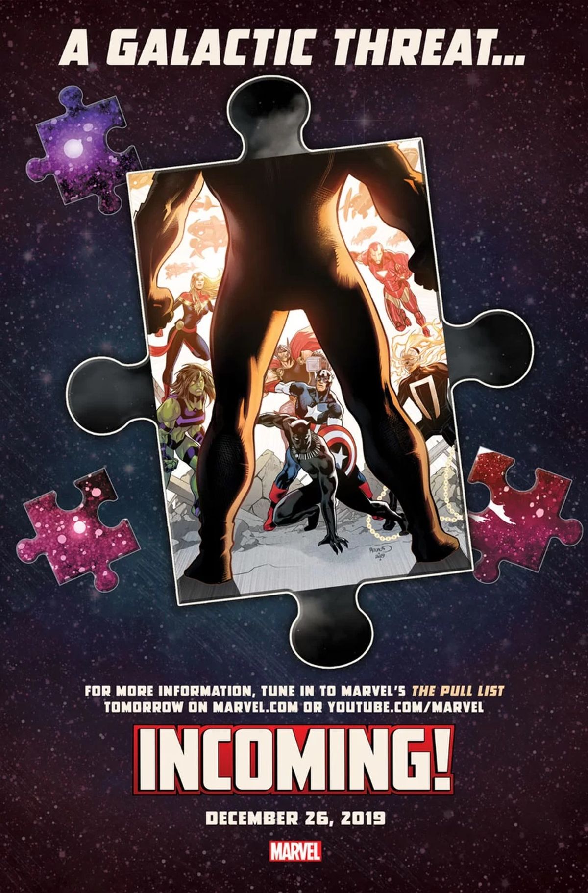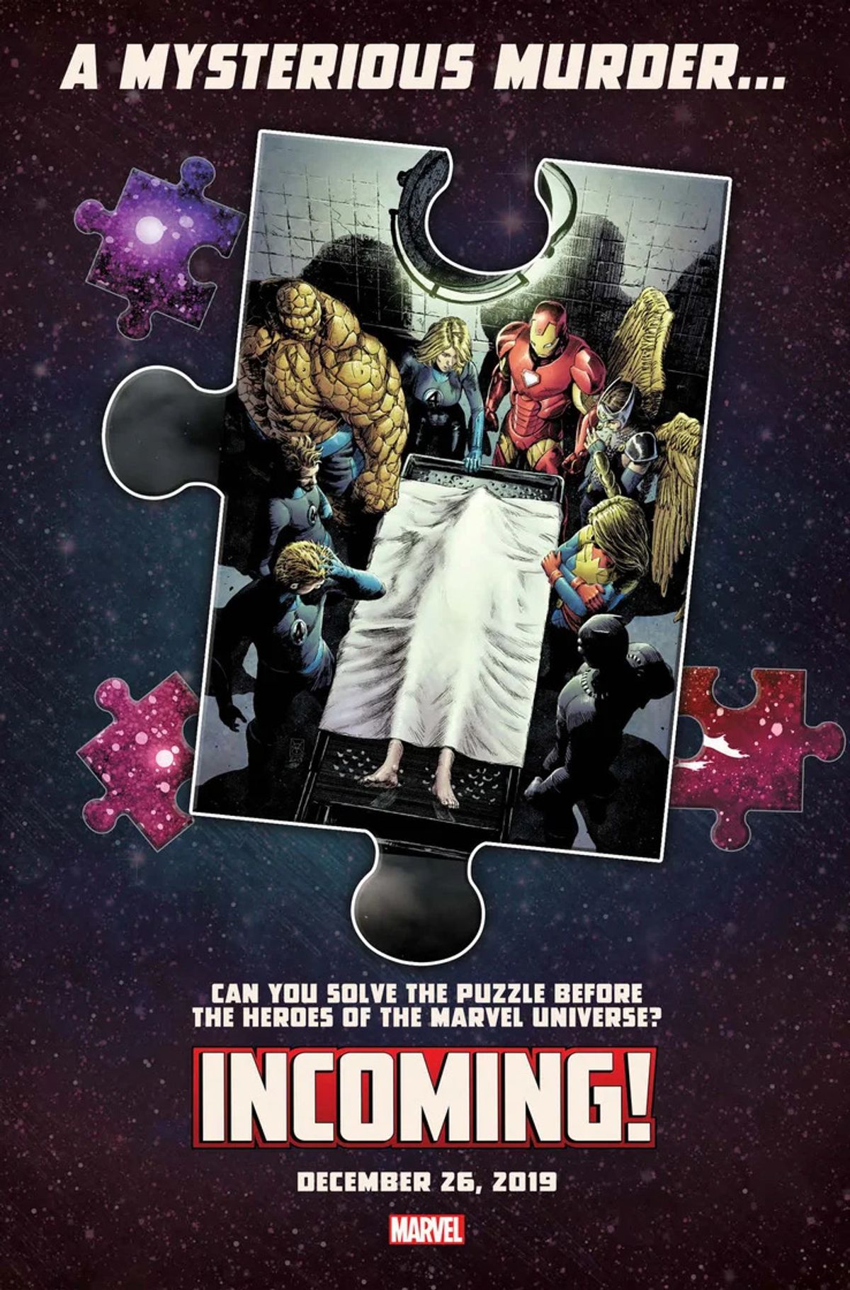 Il 26 dicembre sarà un giorno importante per tutti gli appassionati di fumetti Marvel: è infatti la data in cui uscirà negli Stati Uniti Incoming #1, speciale di novantasei pagine che, oltre a chiudere le celebrazioni per gli ottant’anni della Casa delle Idee, innescherà le storie che leggeremo nel corso del 2020.Gli elementi sul progetto forniti finora offrono pochissimi punti fermi: sappiamo che la trama ruoterà attorno a un misterioso omicidio e che l’indagine coinvolgerà la quasi totalità della comunità supereroisitca Marvel.