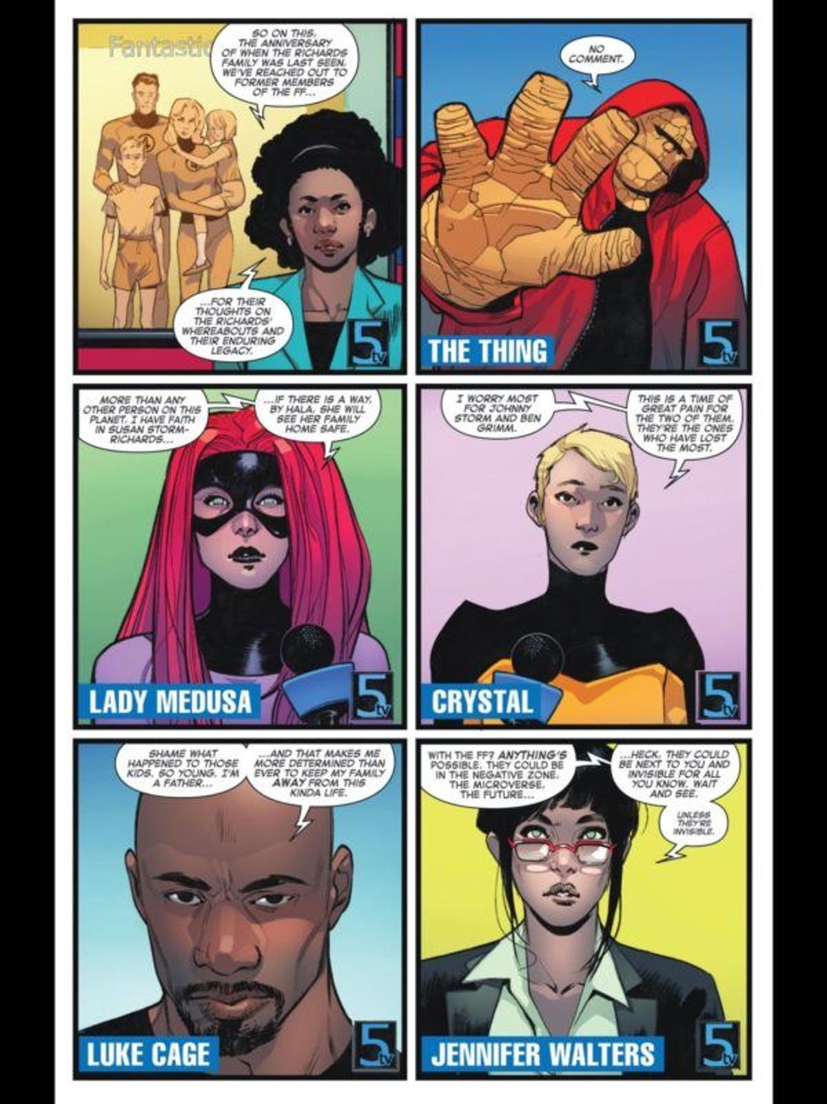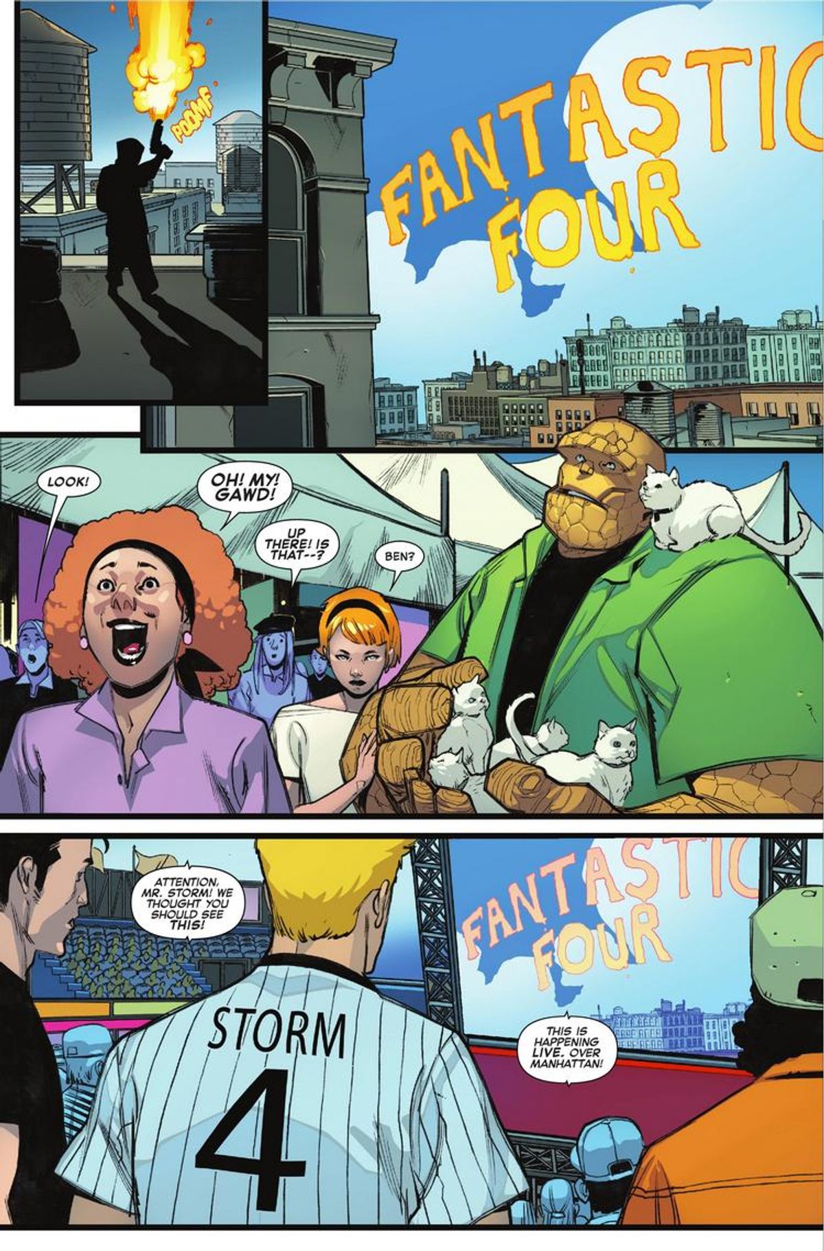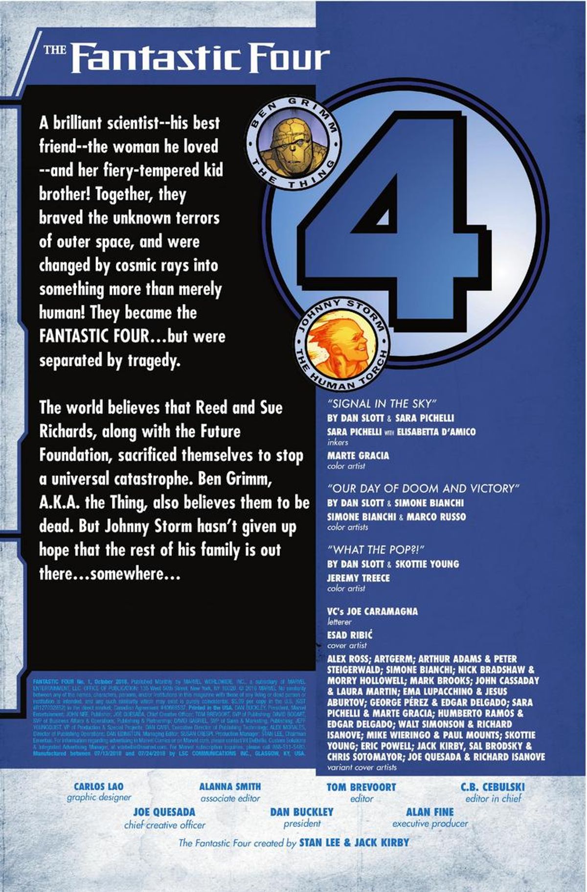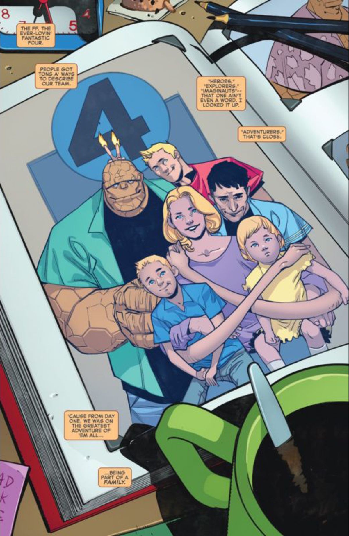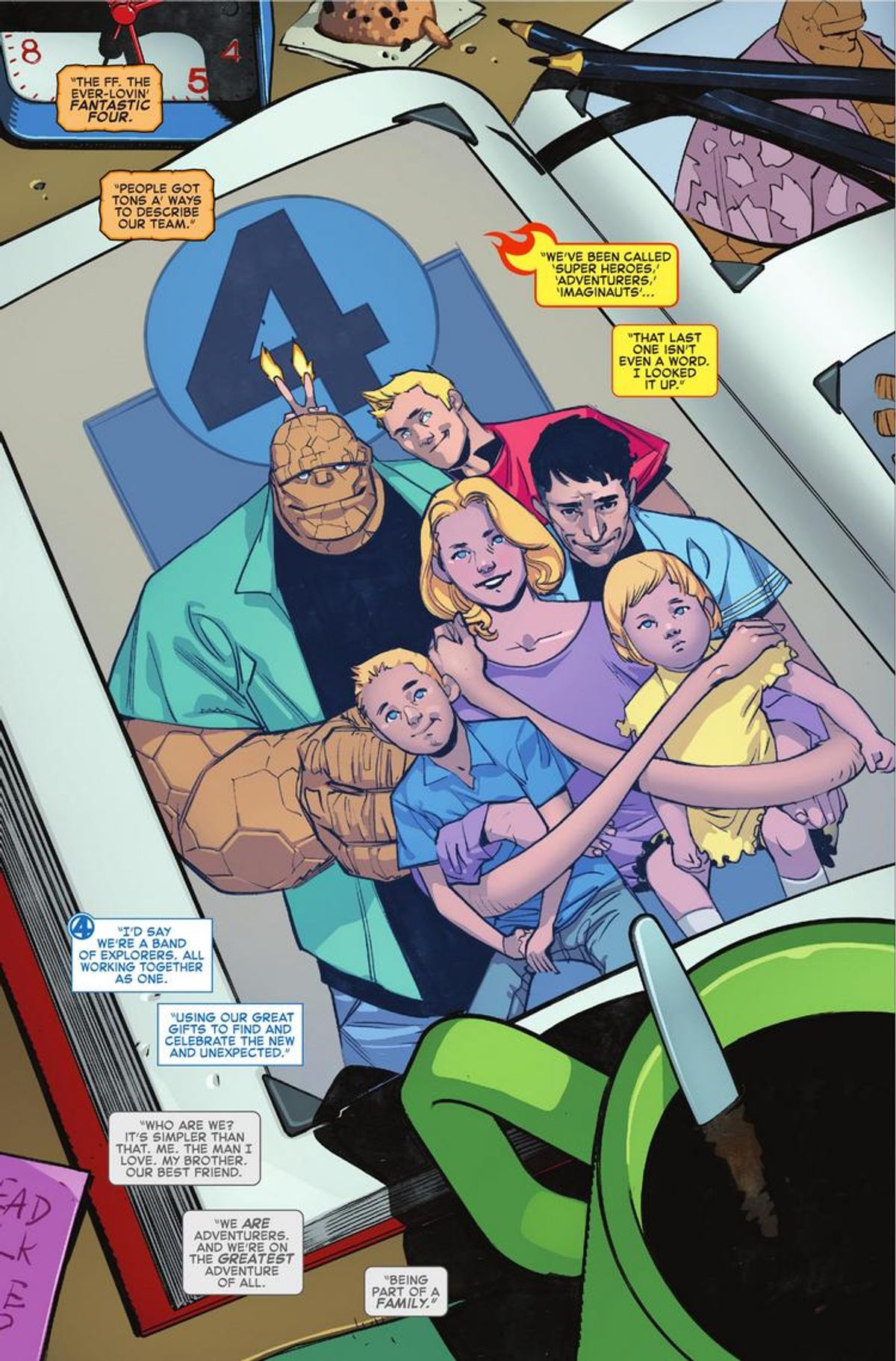 Di seguito vi presentiamo la sinossi del numero #1, seguita dall'anteprima definitiva. A tal proposito, è doveroso sottolineare un cambio in corsa da parte della Casa delle Idee: la precedente versione della tavola che apre la storia vedeva Ben Grimm come unico narratore, mentre ora le varie didascalie rispecchiano anche le voci di Reed Richards, sua moglie Sue Richards e Johnny Storm, indicando che si tratta di un racconto corale da parte della Prima Famiglia Marvel. Potete fare un confronto nella gallery sottostante.