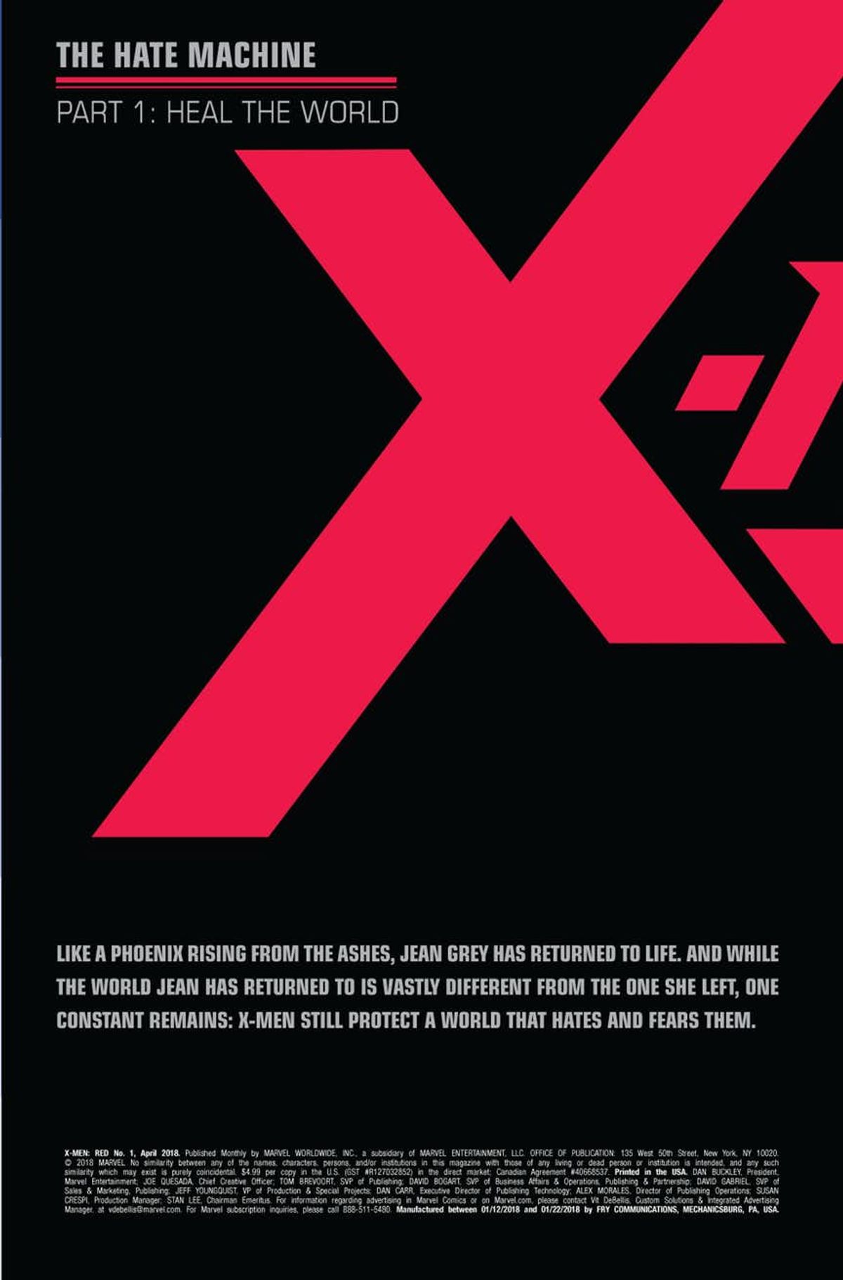 Dopo aver fatto ritorno nella miniserie Phoenix Resurrection, l'originale Jean Grey (morta nel 2004 sulle pagine di New X-Men di Grant Morrison) guiderà un'inedita squadra di mutanti sulla testata X-Men: Red.Il primo numero, con il quale avrà inizio l'arco narrativo The Hate Machine, è previsto per mercoledì 7 febbraio negli Stati Uniti. L'albo sarà scritto da Tom Taylor (All-New Wolverine) e disegnato da Mahmud Asrar (Totally Awesome Hulk), mentre la copertina sarà firmata da Travis Charest.