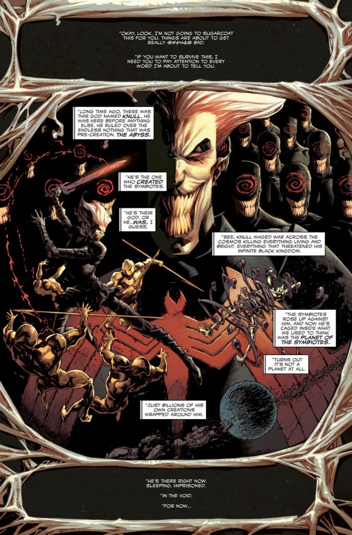 Dopo l'uscita del prologo, proposto sulle pagine dell'albo gratuito Spider-Man/Venom #1 e distribuito in occasione del Free Comic Book Day, nelle scorse ore Stegman ha twittato alcune tavole tratte da Absolute Carnage #1.Nella storia vedremo il redivivo Kasady in simbiosi con Knull, il dio dei simbionti, come i lettori italiani di Venom già ben sanno. Carnage sta dando la caccia a chiunque abbia mai fuso il proprio organismo con quello di un simbionte per ottenere i frammenti del codice genetico che restano latenti nell'individuo. Tramite essi, Knull potrebbe nuovamente tornare al massimo della potenza.