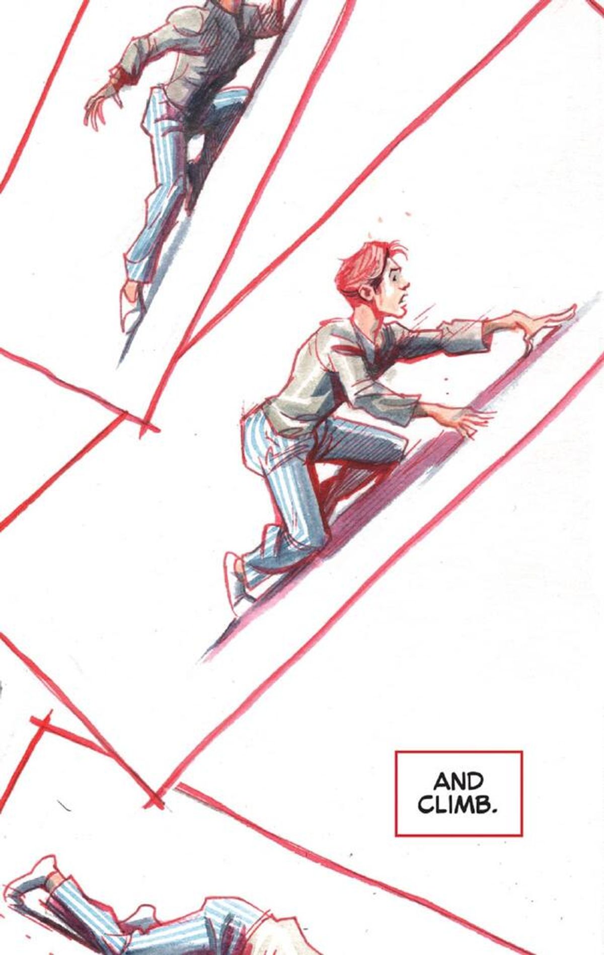 Ferreyra - La storia si concentra su Peter che si muove vanti e indietro tra il sogno e il mondo reale, quindi ho deciso di rappresentare il mondo reale con uno stile tradizionale per una serie di super eroi, per cui ho utilizzato chine e colorazione digitali. Per il mondo dei sogni, invece, ho utilizzato un miscuglio di tecniche. Pastelli, acquerelli e pittura a guazzo. Un risultato molto meno pulito, più sfumato, a rappresentare un paesaggio onirico.